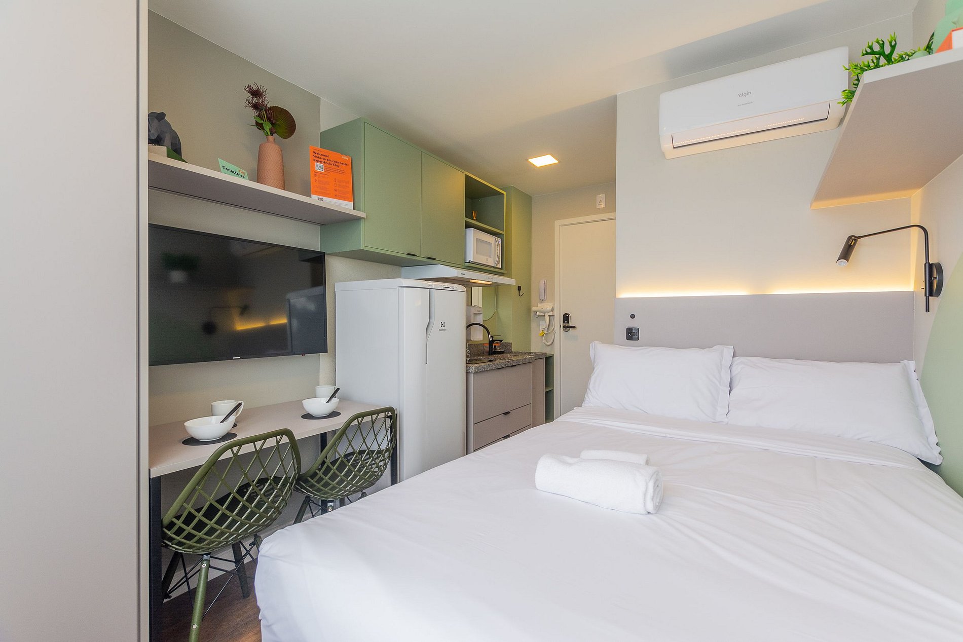 Oferecemos apartamentos Studio e de 1 quarto, totalmente mobiliados, com ar-condicionado split, TV Smart, internet de alta velocidade, cozinha equipada e enxoval completo de cama e banho. Aqui, você terá tudo o que precisa para desfrutar de uma estadia agradável.