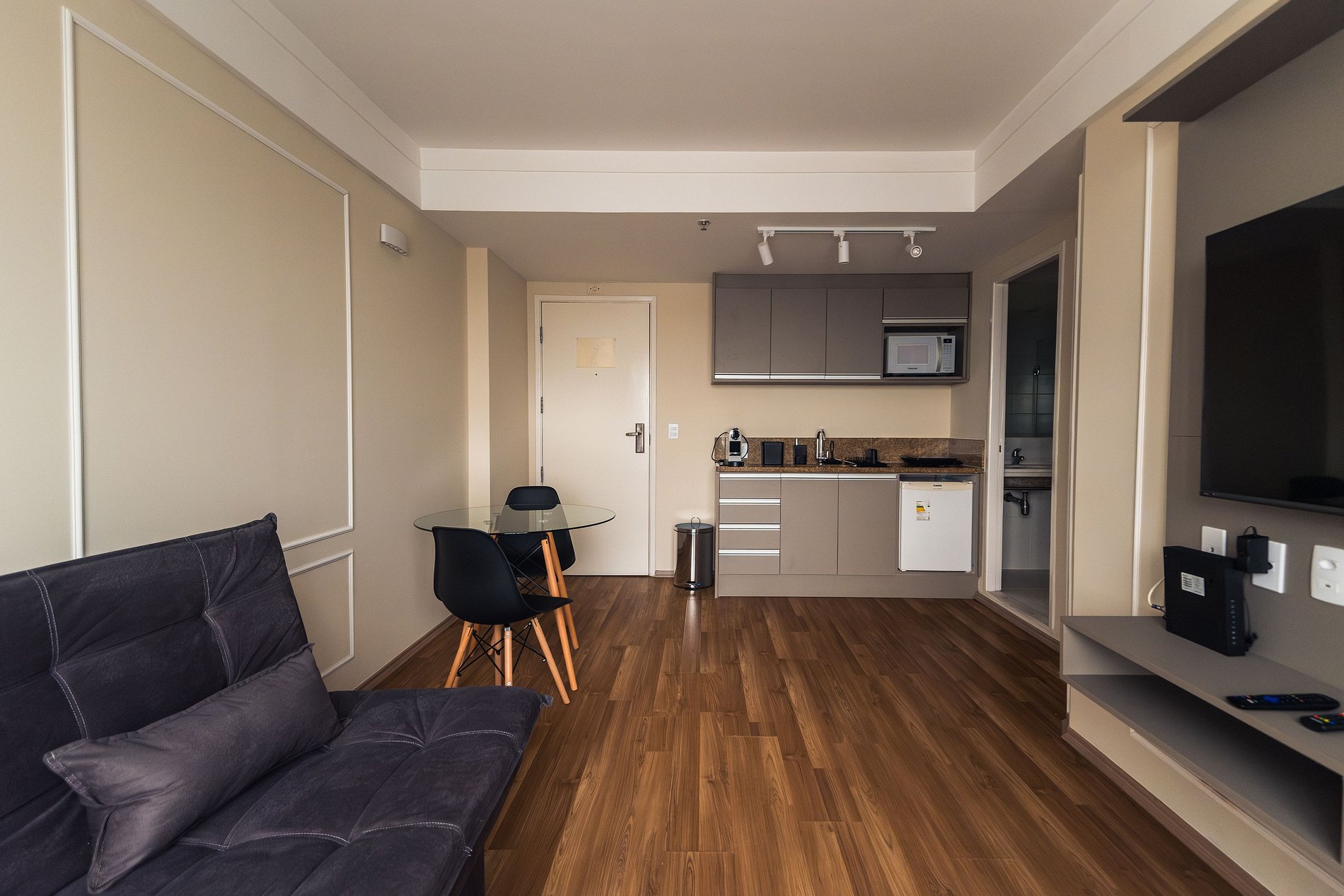 Apartamento de 34m² com 1 cama de casal queen no quarto equipado com enxoval de cama e ar condicionado, closet com ferro de passar e cabides, sofá cama na sala e Tvs com acesso a canais a cabo, area de home office, cozinha compacta com cooktop portátil de 2 bocas, frigobar, nespresso, sanduicheira, microondas, filtro de água integrado a torneira, mesa de jantar com 2 lugares, pia com armário, utensílios de cozinha com jogo de panelas, banheiro privativo com box integrado, ducha higiênica, amenities de banho, secador de cabelo, espelho de aumento e enxoval de banho.