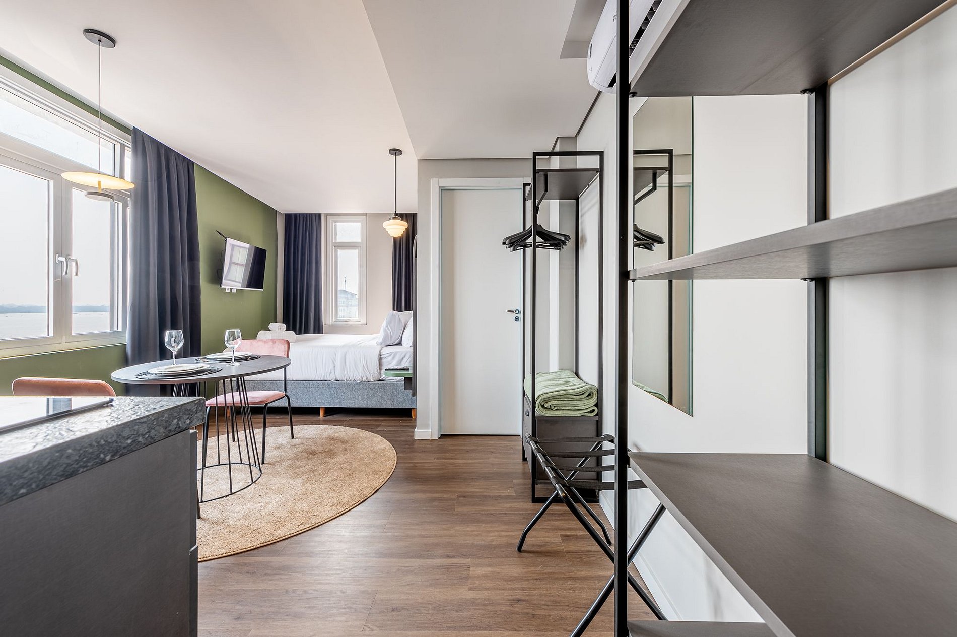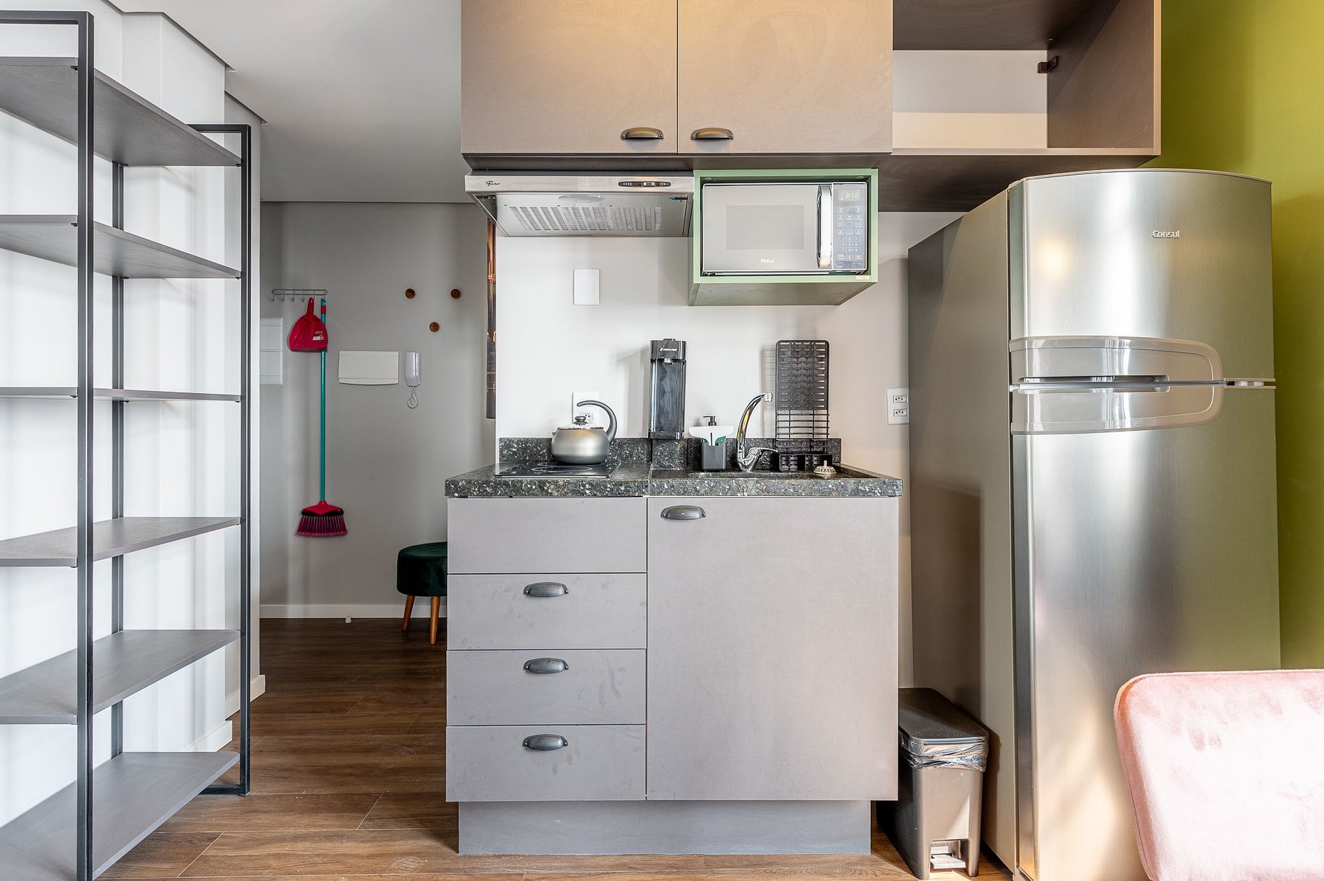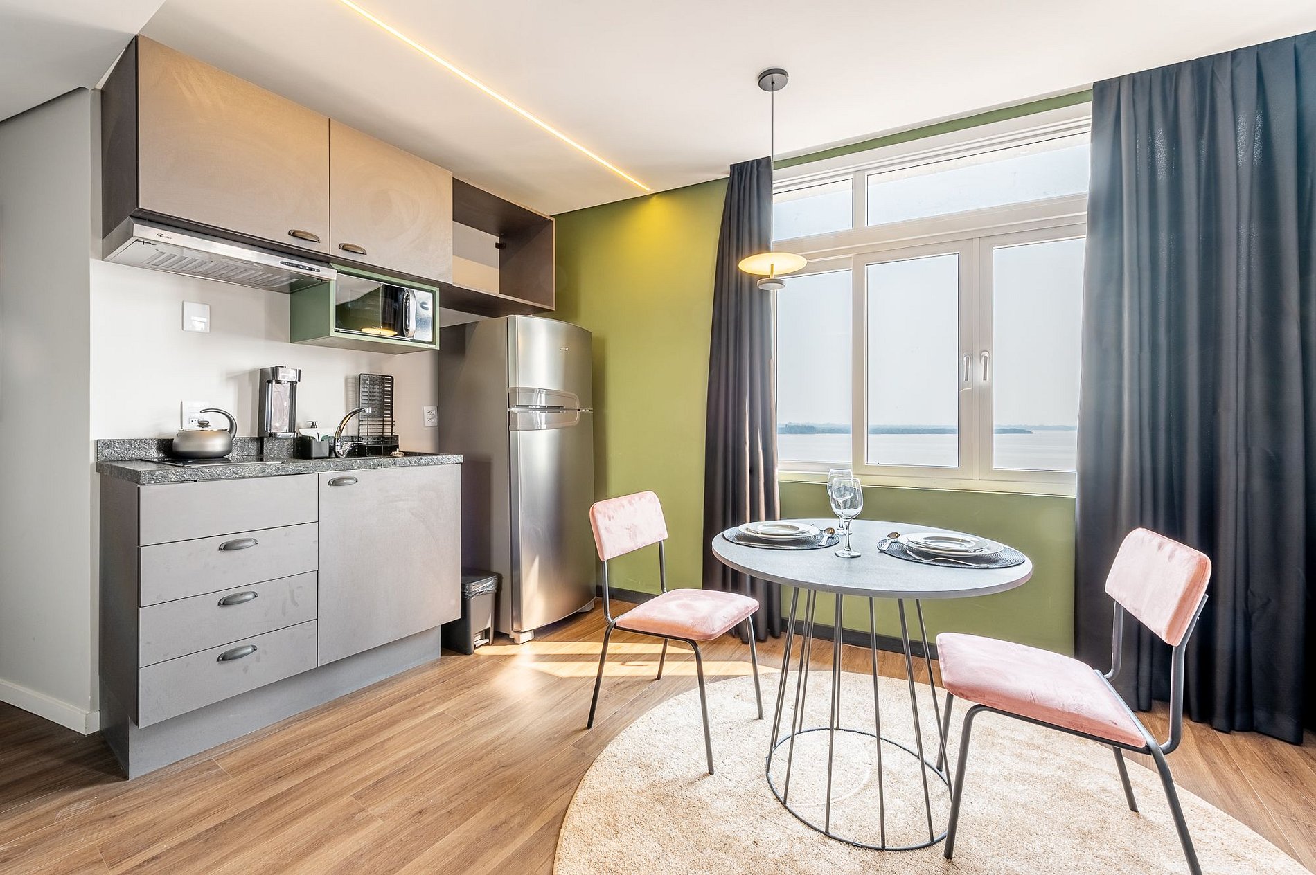 Se hospede em um espaço moderno, aconchegante e feito sob medida para oferecer conforto e praticidade. Esta suíte de 28m² é perfeita para quem busca uma estadia tranquila, com todos os detalhes pensados para o seu bem-estar. A cozinha é completa, equipada com geladeira, micro-ondas, cooktop por indução, depurador e os utensílios necessários para preparar desde um lanche rápido até uma refeição especial. A mesa para duas pessoas é ideal tanto para refeições quanto para quem precisa trabalhar com conforto.