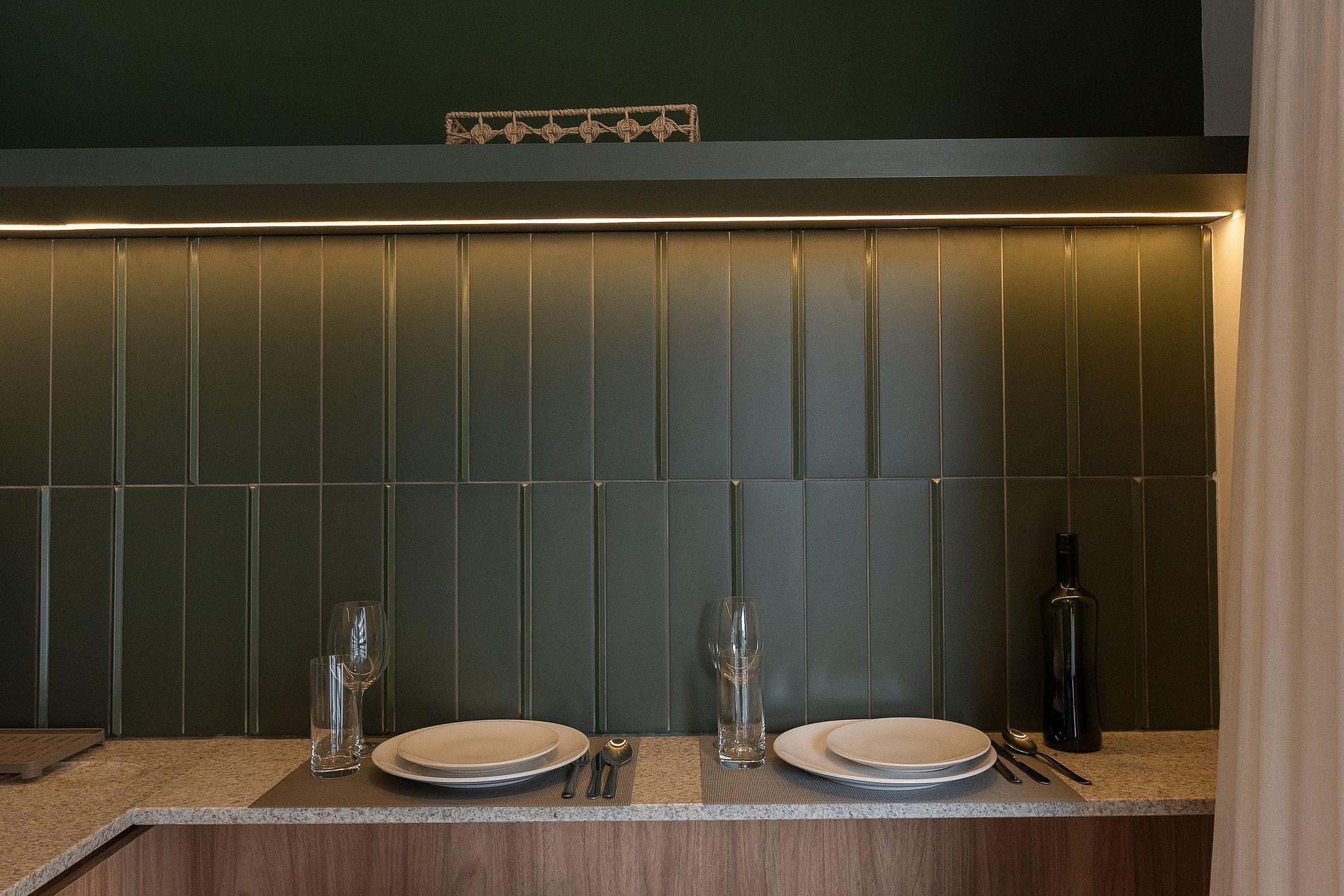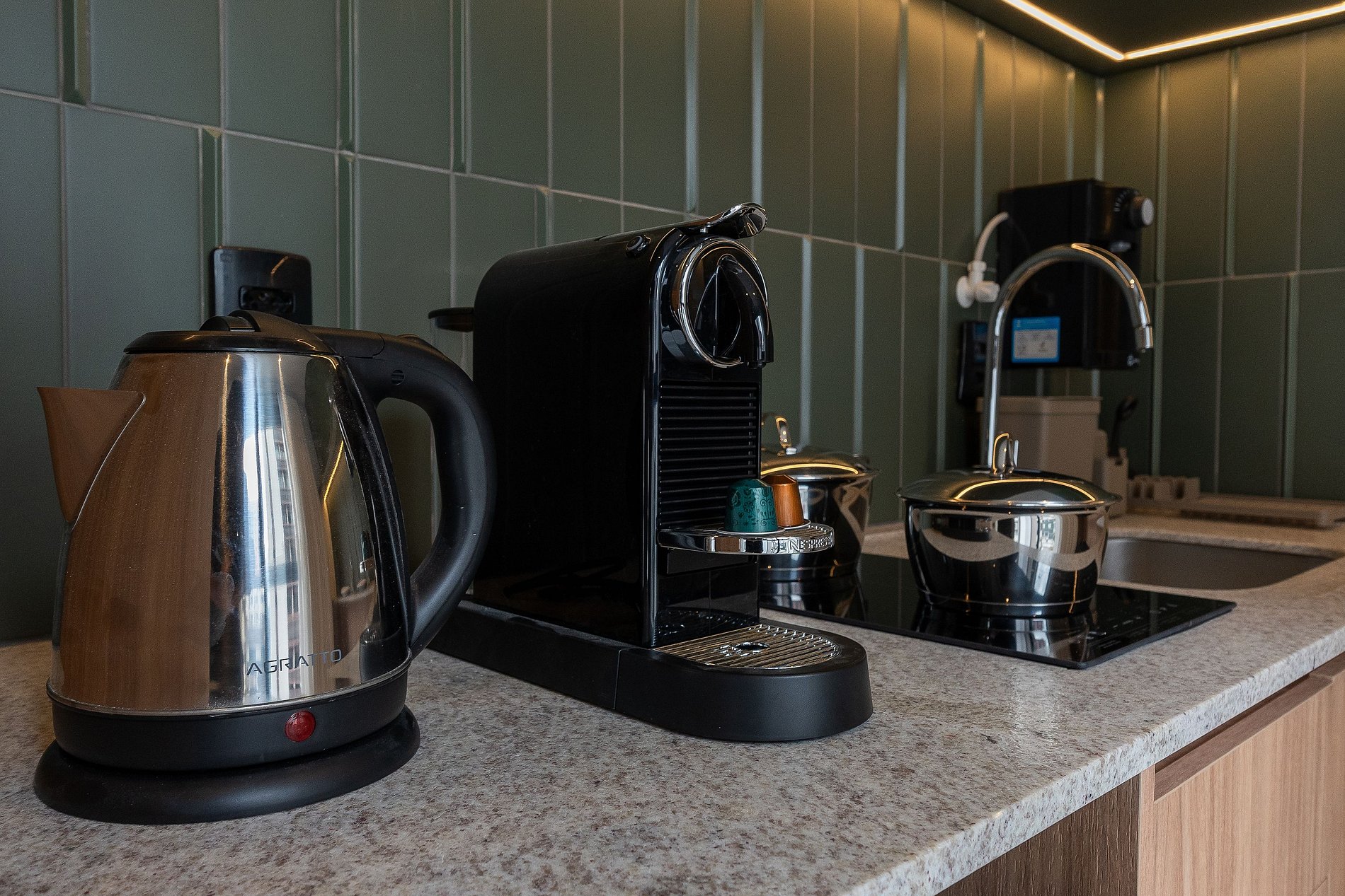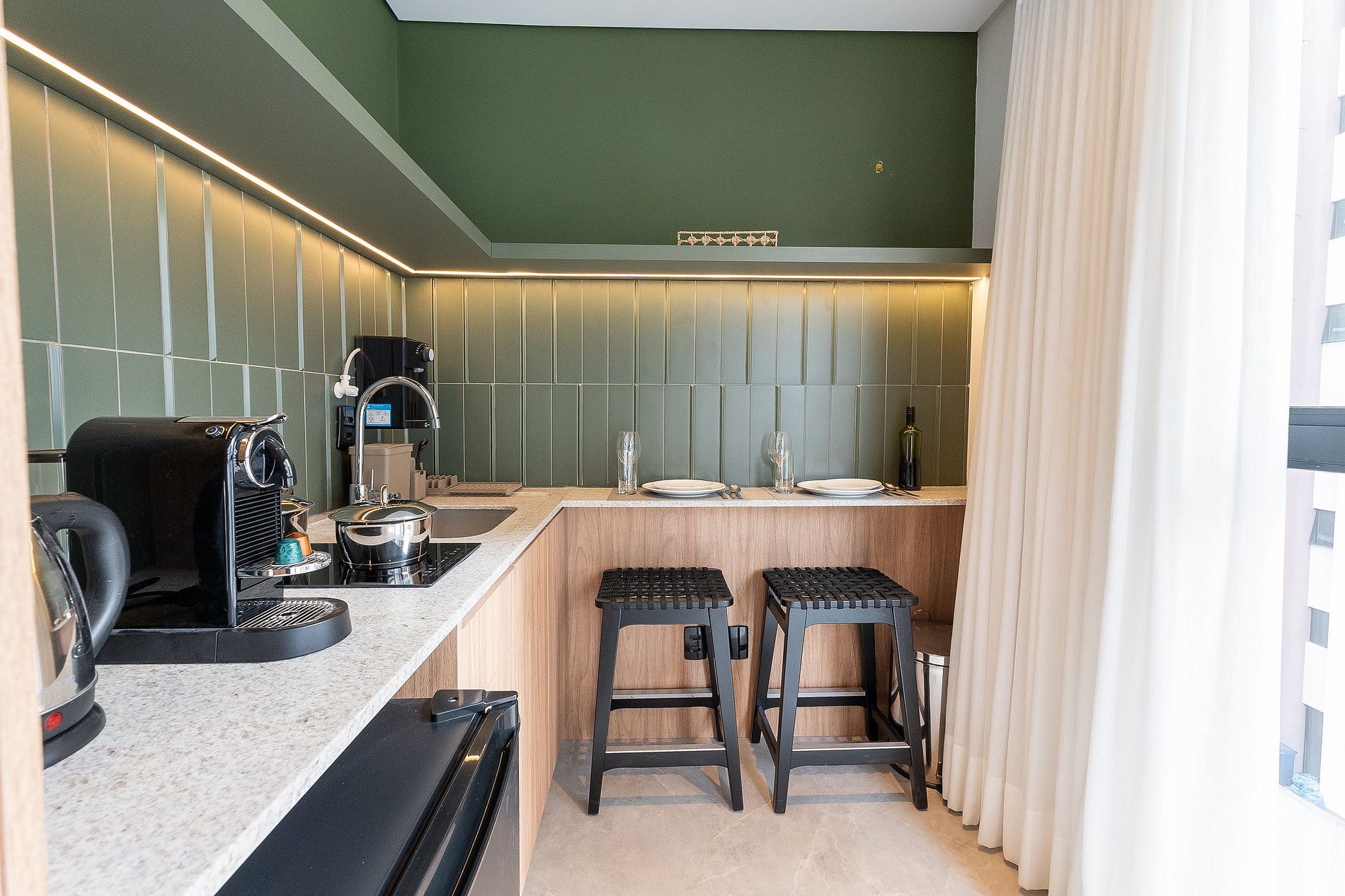 Cozinha equipada com cooktop, geladeira, micro-ondas, cafeteira elétrica, filtro de água e utensílios para preparar suas refeições favoritas