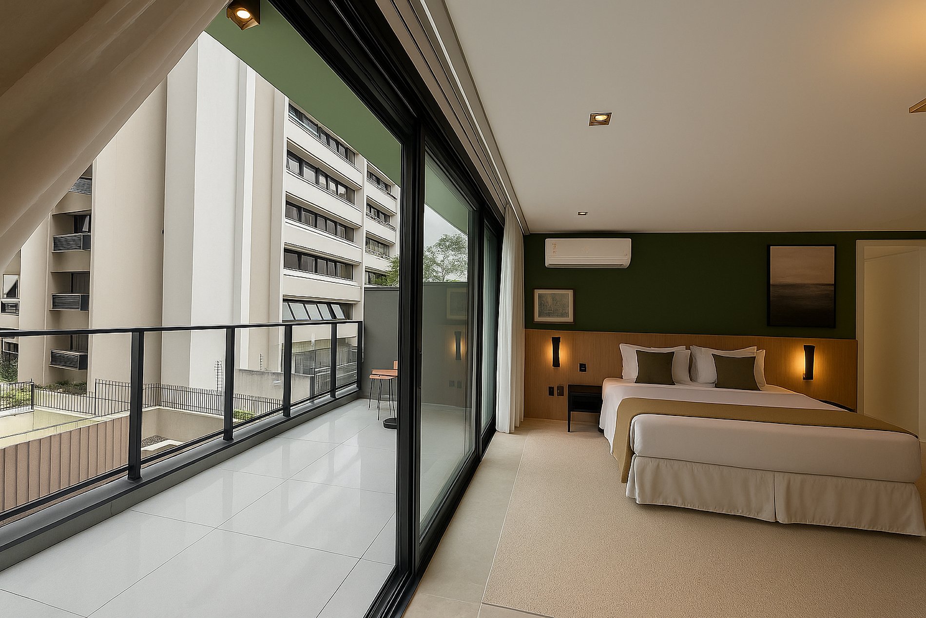 Cama queen com enxoval impecável, ar-condicionado e cortinas blackout para noites de descanso profundo