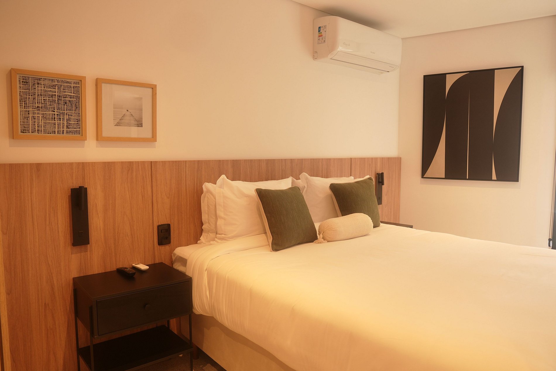 No quarto, a cama queen é equipada com enxoval de qualidade, ar-condicionado para noites agradáveis e cortinas blackout que garantem o descanso merecido. Um espaço que acolhe, sem exageros.