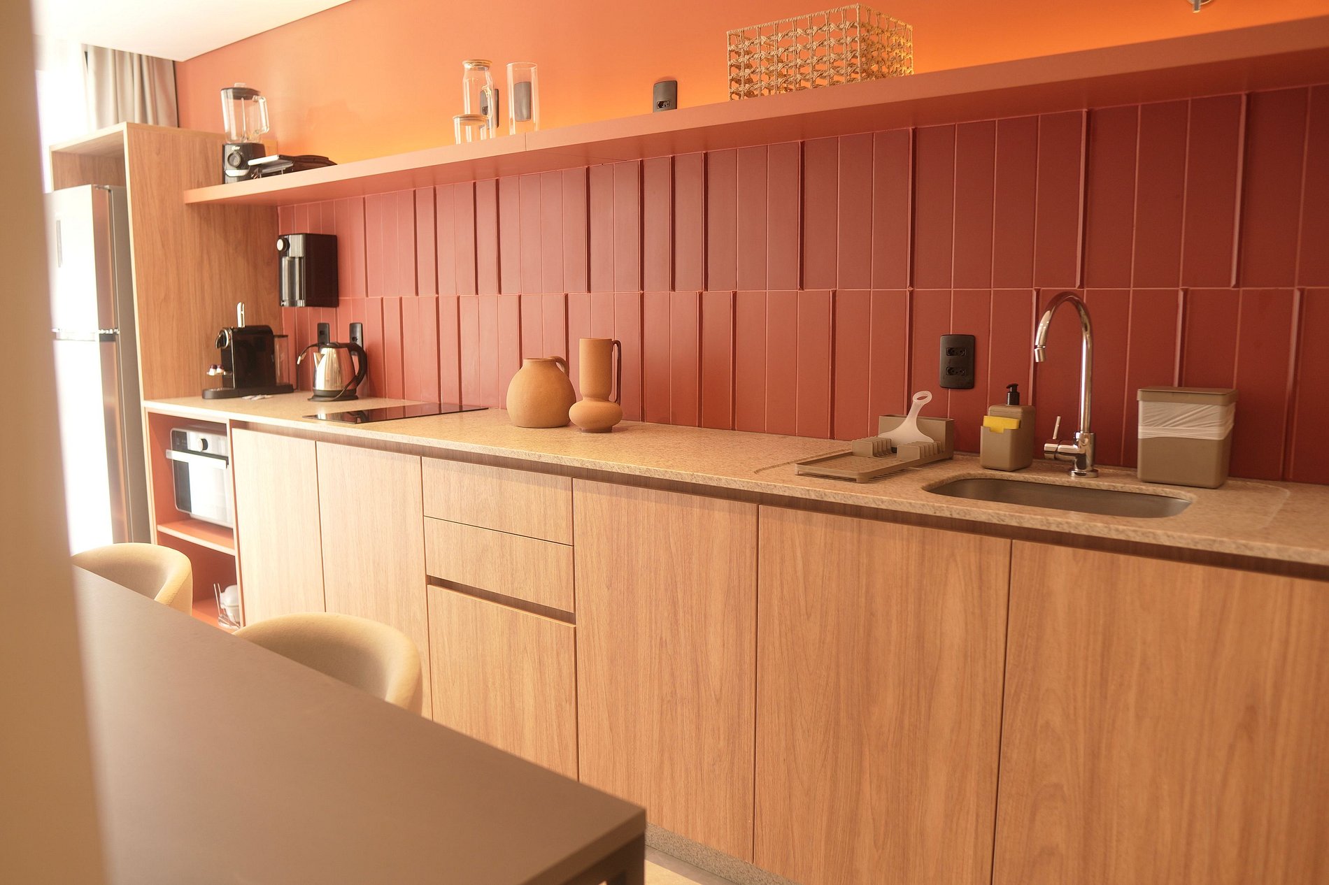 Nada de improviso: aqui você encontra uma cozinha completa com cooktop de indução, forno elétrico, micro-ondas, depurador, geladeira, filtro de água e todos os utensílios necessários para preparar desde um café da manhã rápido até um jantar especial. Tudo prático, limpo e funcional.