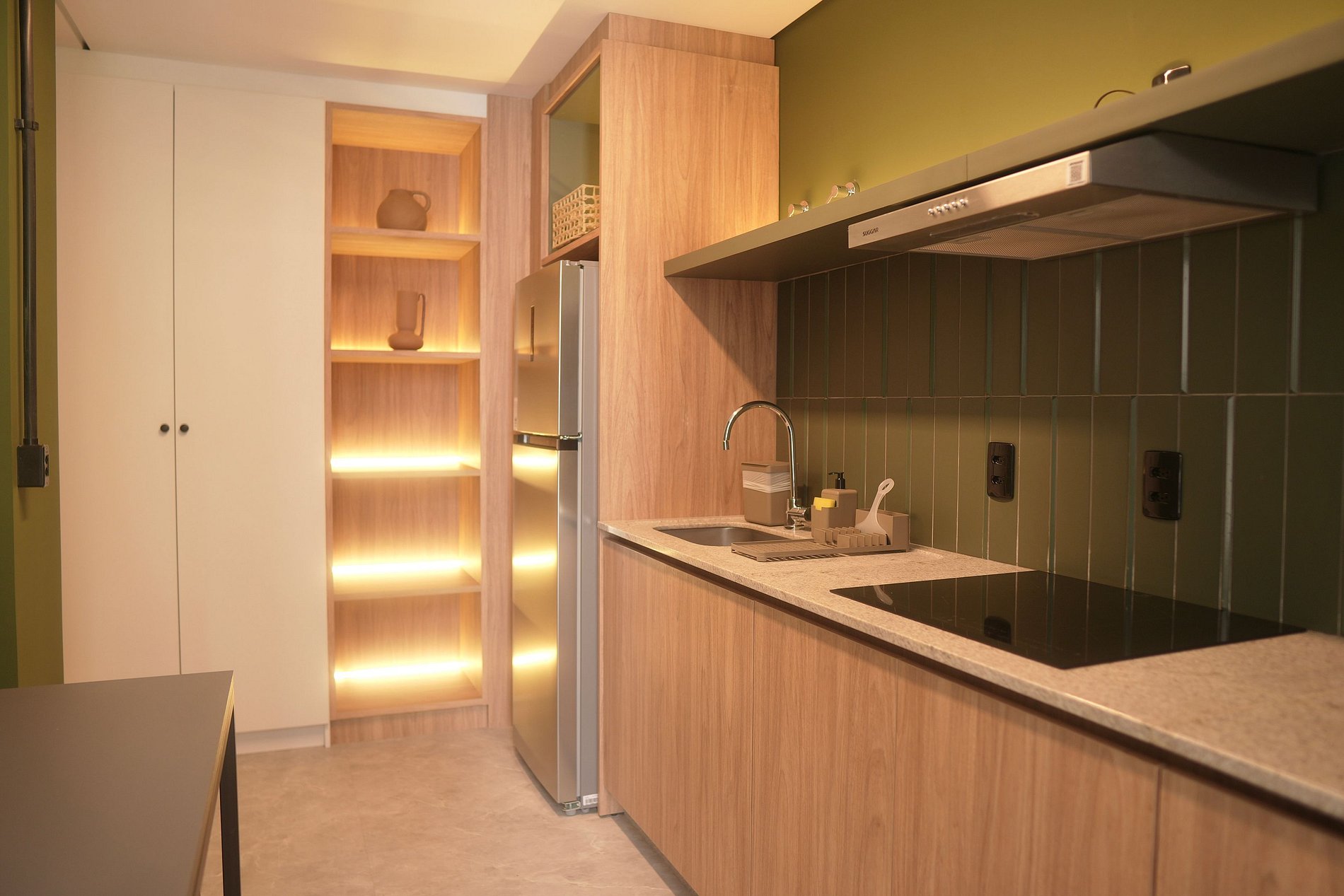 Nada de improviso: aqui você encontra uma cozinha completa com cooktop de indução, forno elétrico, micro-ondas, depurador, geladeira, filtro de água e todos os utensílios necessários para preparar desde um café da manhã rápido até um jantar especial. Tudo prático, limpo e funcional.