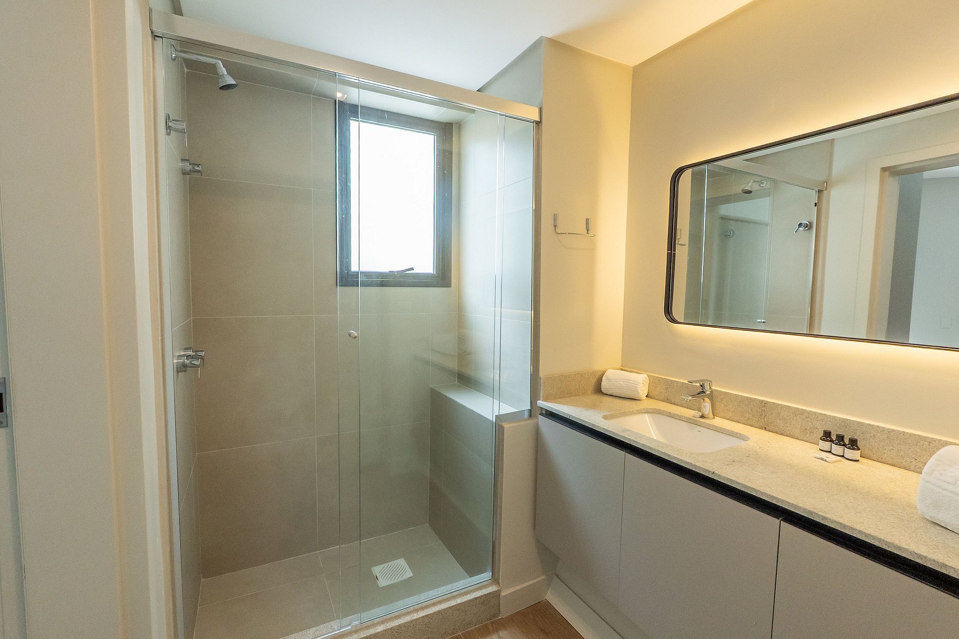 Ao entrar, você encontra uma sala agradável com sofá, TV, ar-condicionado e uma mesa para refeições ou trabalho, tudo com iluminação natural e cortinas blackout para o seu descanso.