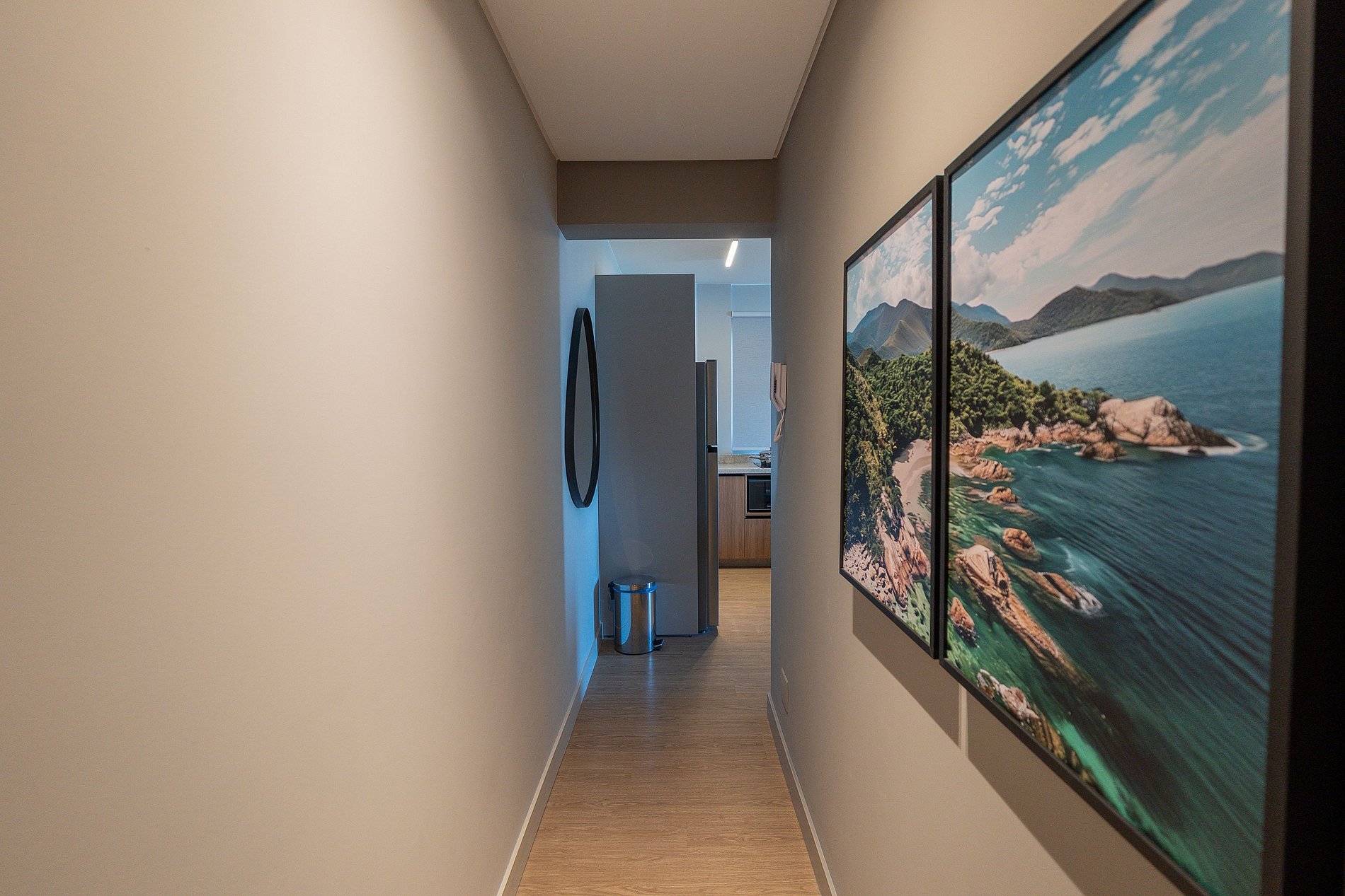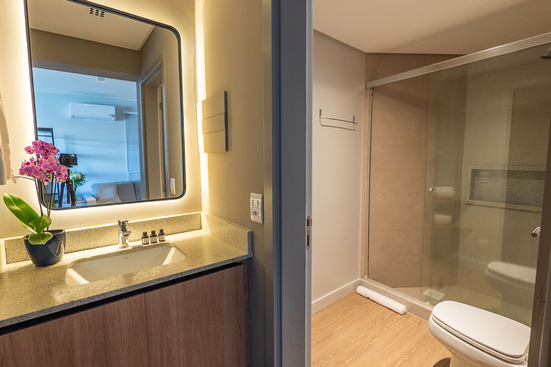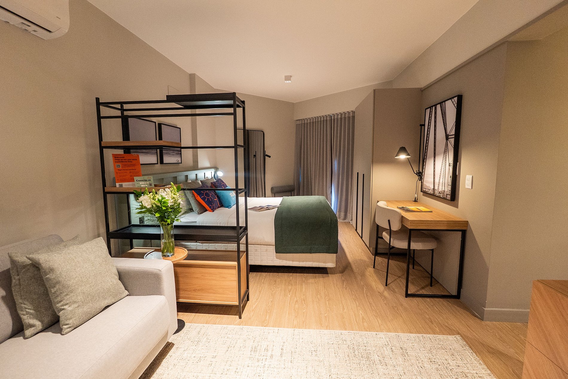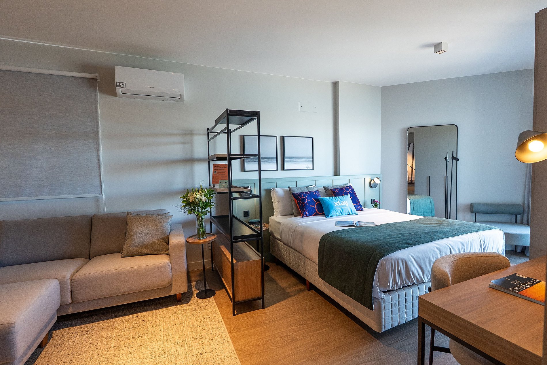 O acesso ao espaço acontece por reconhecimento facial e portaria 24hrs. A senha da unidade será enviada após o seu check-in, através do aplicativo Xtay ou Web-check-in, conforme informado por mensagem. O condomínio conta piscina, academia, lavanderia paga à parte, coworking e mercadinho 24hrs.