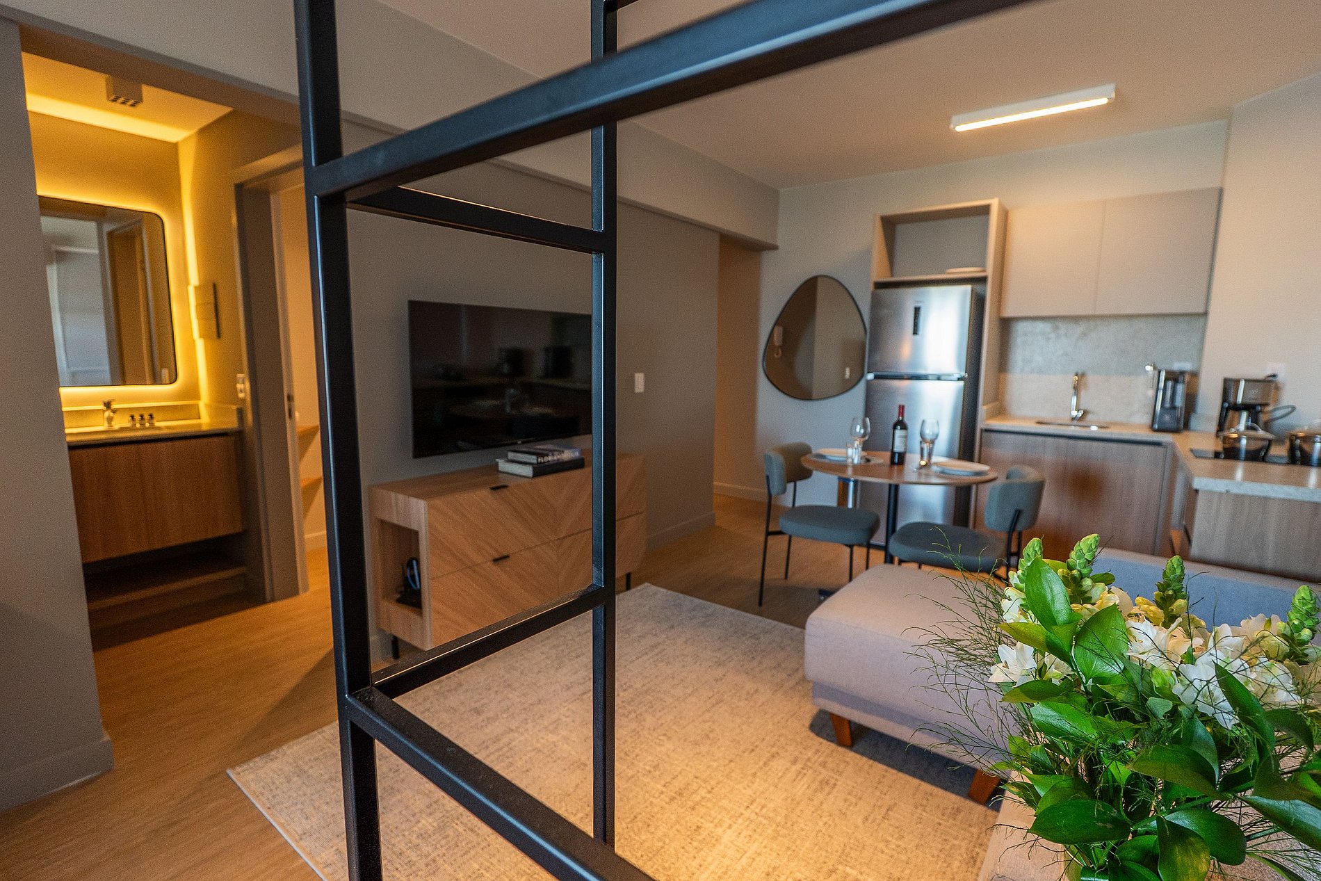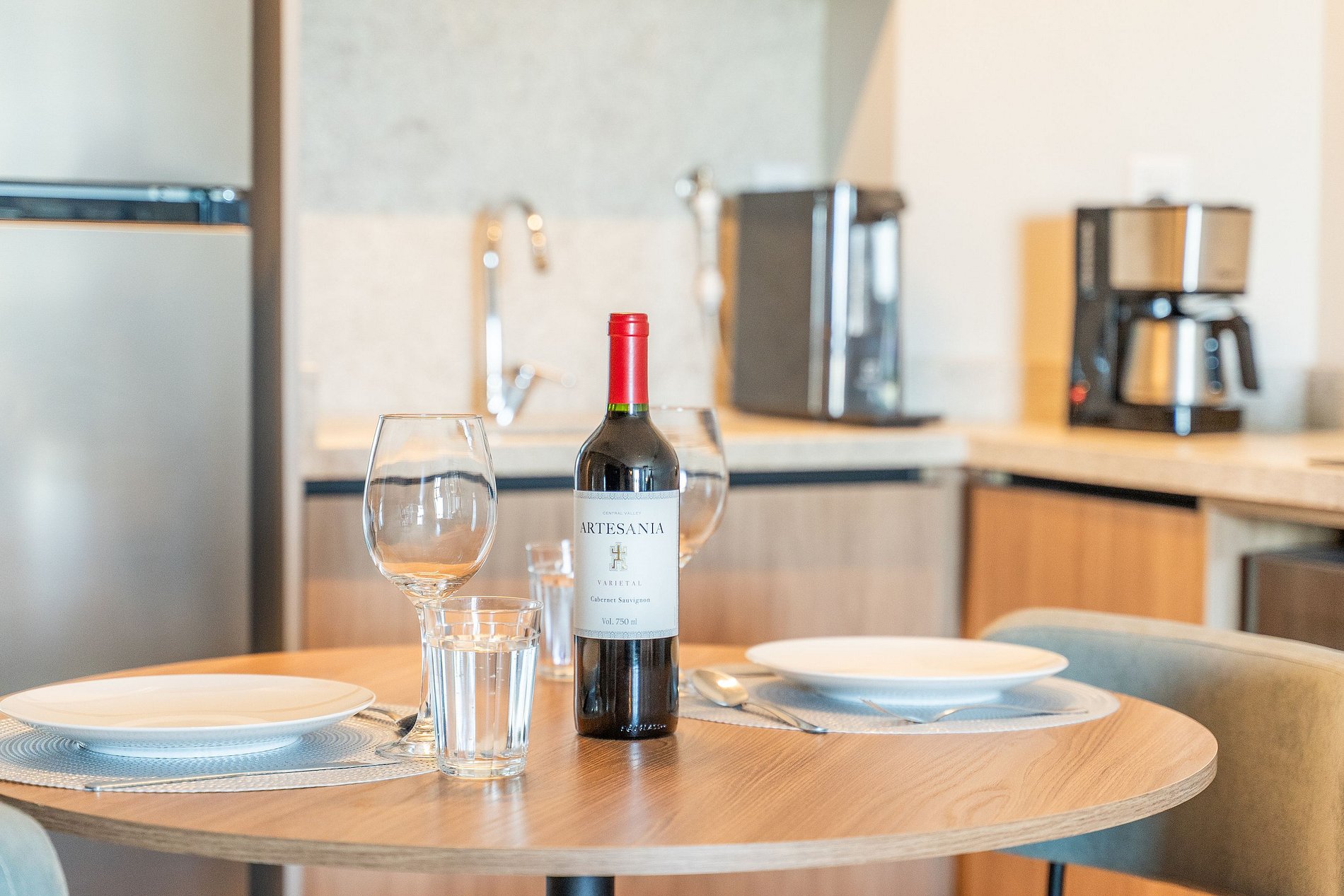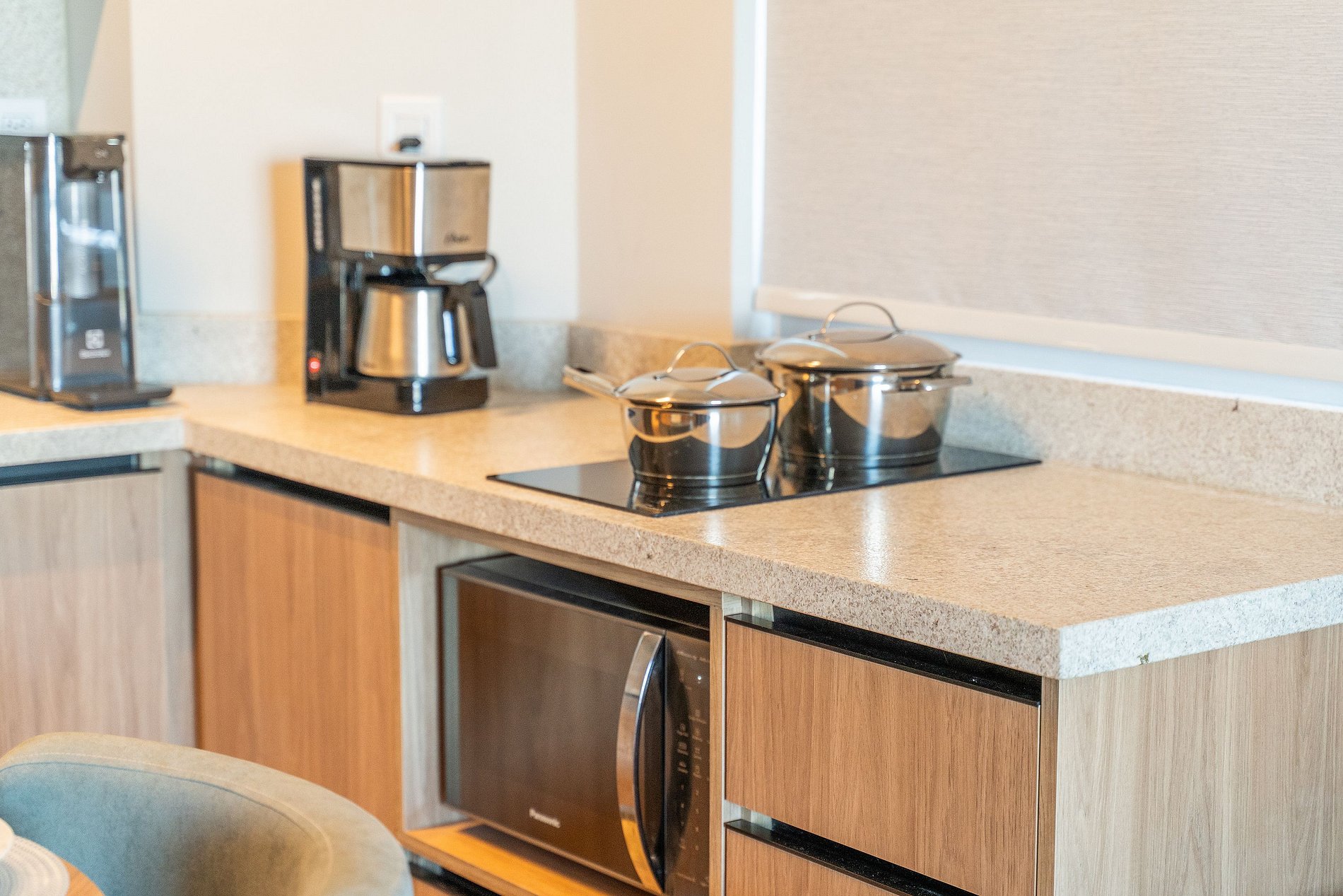 A cozinha equipada permite preparar desde um café da manhã leve até refeições completas, com cooktop de indução, micro-ondas, geladeira, filtro de água e todos os utensílios que você precisa. A mesa de jantar para dois cria o cenário ideal para um jantar tranquilo ou até mesmo para momentos a dois.