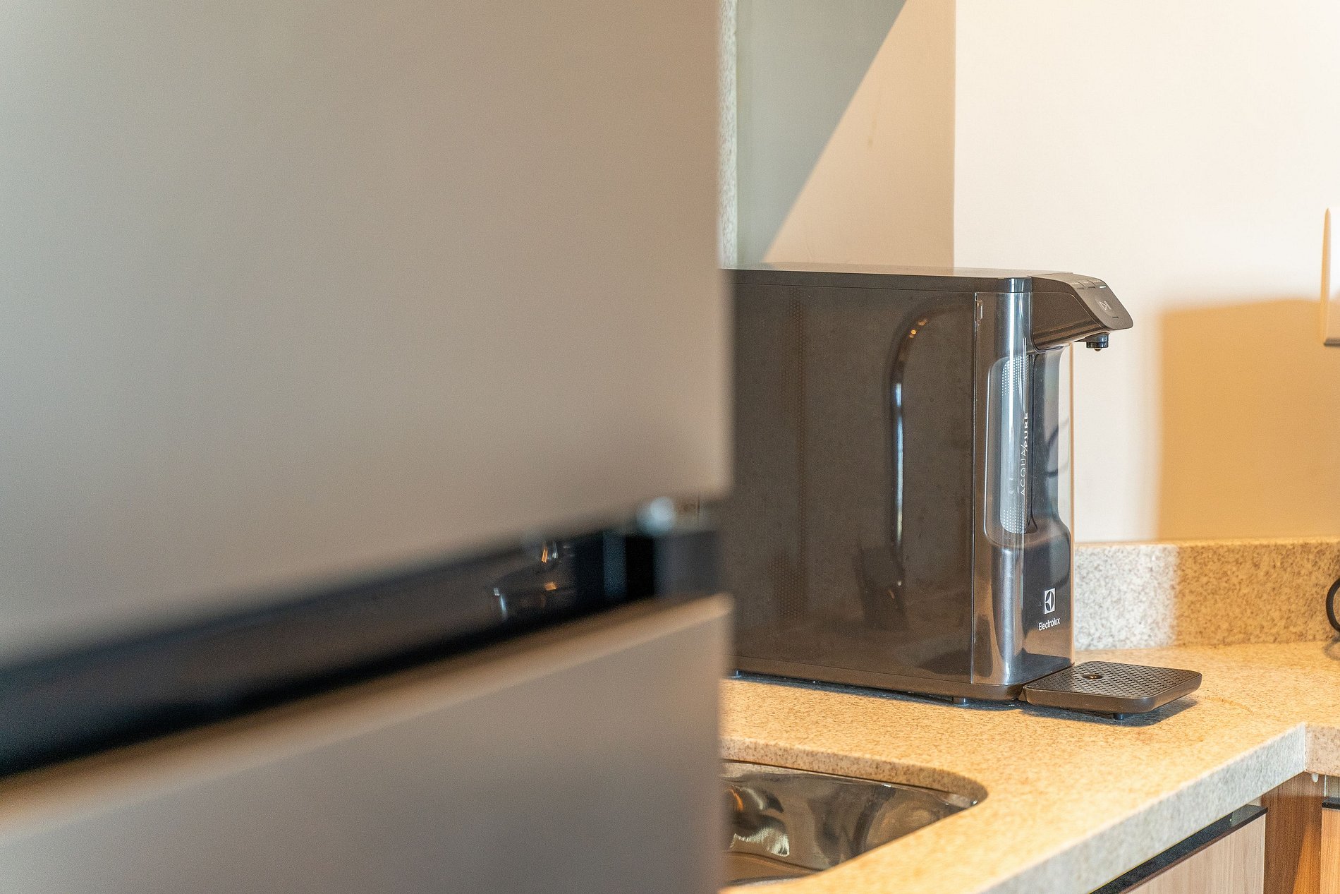 A cozinha equipada permite preparar desde um café da manhã leve até refeições completas, com cooktop de indução, micro-ondas, geladeira, filtro de água e todos os utensílios que você precisa. A mesa de jantar para dois cria o cenário ideal para um jantar tranquilo ou até mesmo para momentos a dois.