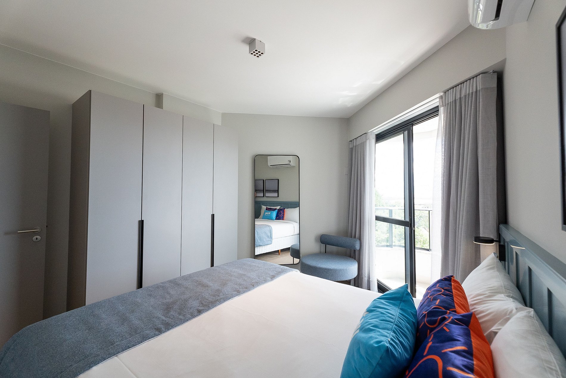 O acesso ao espaço acontece por reconhecimento facial e portaria 24hrs. A senha da unidade será enviada após o seu check-in, através do aplicativo Xtay ou Web-check-in, conforme informado por mensagem. O condomínio conta piscina, academia, lavanderia paga à parte, coworking e mercadinho 24hrs.