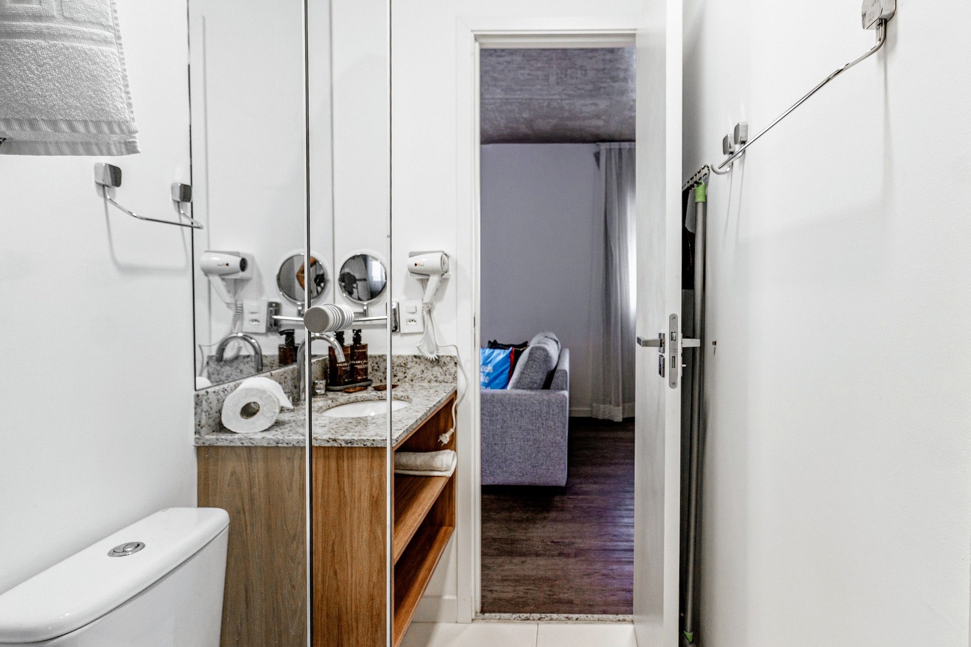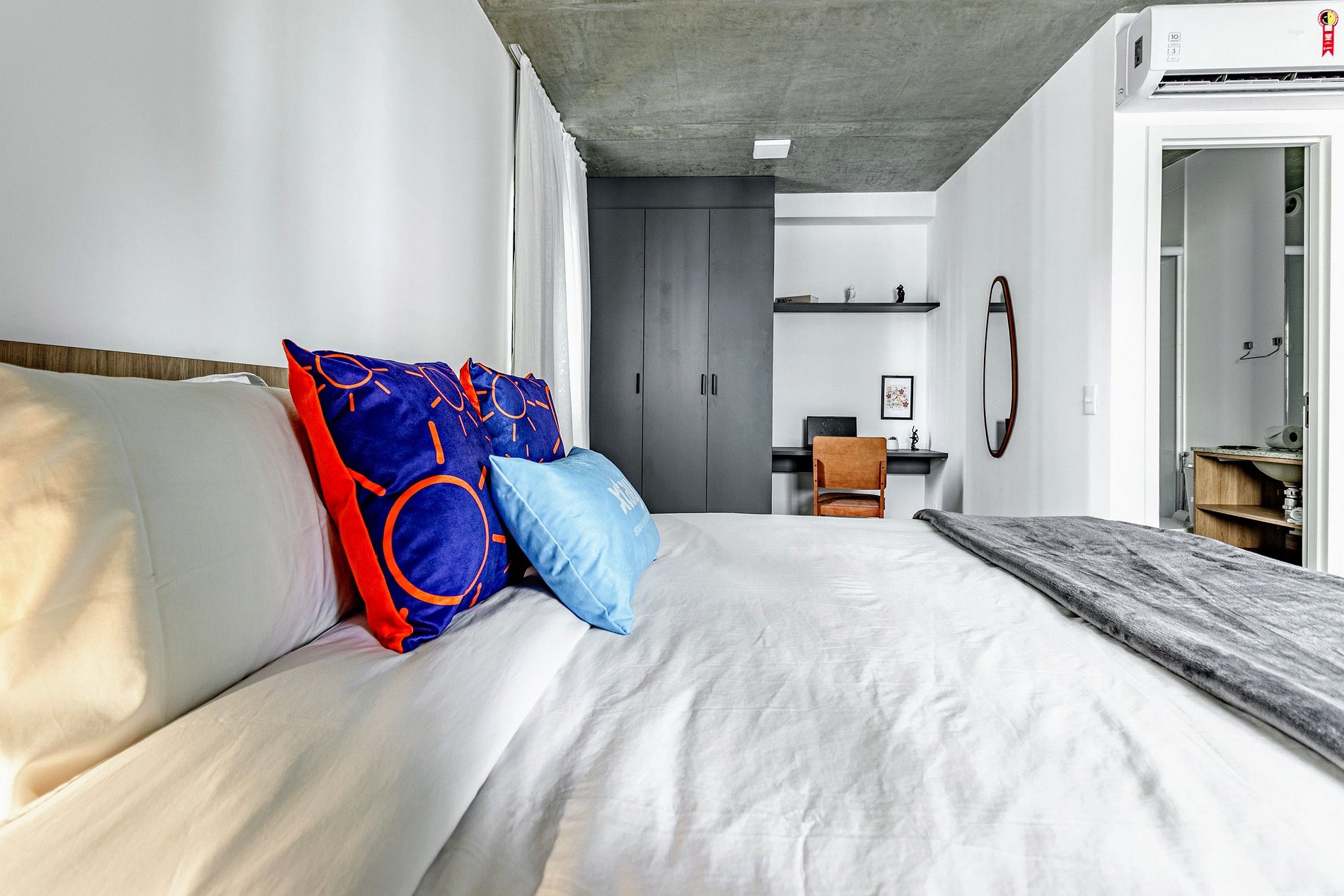 Studio de 45m² com cama de casal queen com enxoval de cama profissional, armário com steamer e cabides, sofá, Tv Smart, ar condicionado, cozinha compacta com cooktop portátil, geladeira, cafeteira Nespresso, sanduicheira, microondas, filtro de água, maquina lava e seca, bancada para refeições com 2 cadeiras, pia com armários, utensílios de cozinha com jogo de panelas, banheiro com amenities de banho, secador de cabelo, espelho de aumento para maquiagem e enxoval de banho.