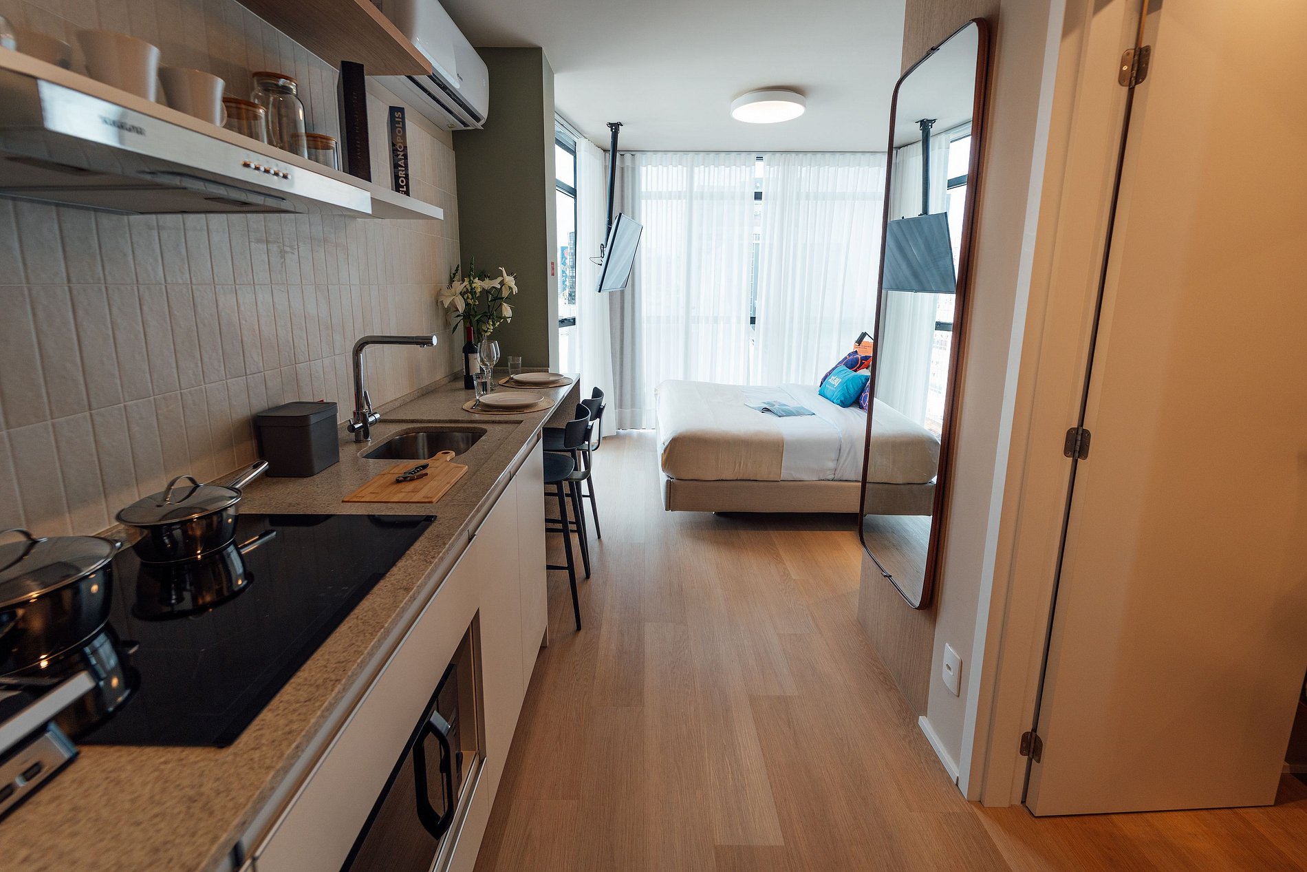 Descubra um espaço de 22m² onde cada detalhe foi pensado para o seu conforto. A cozinha é prática e completa: geladeira para manter tudo fresco, micro-ondas para refeições rápidas e cooktop de indução com duas bocas para preparar seus pratos favoritos. O depurador mantém o ambiente agradável e o filtro de água garante saúde. Utensílios e louças estão à sua disposição.