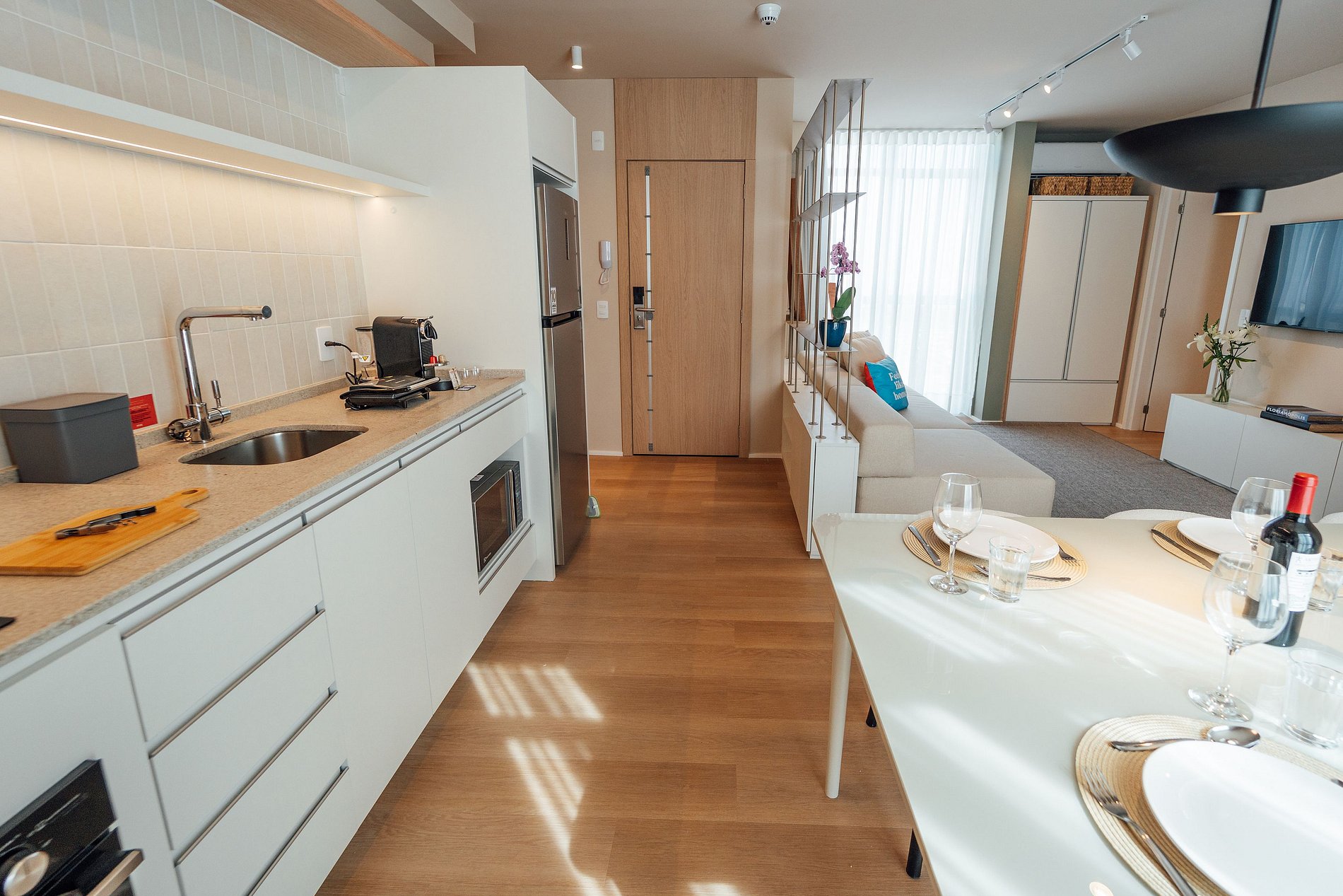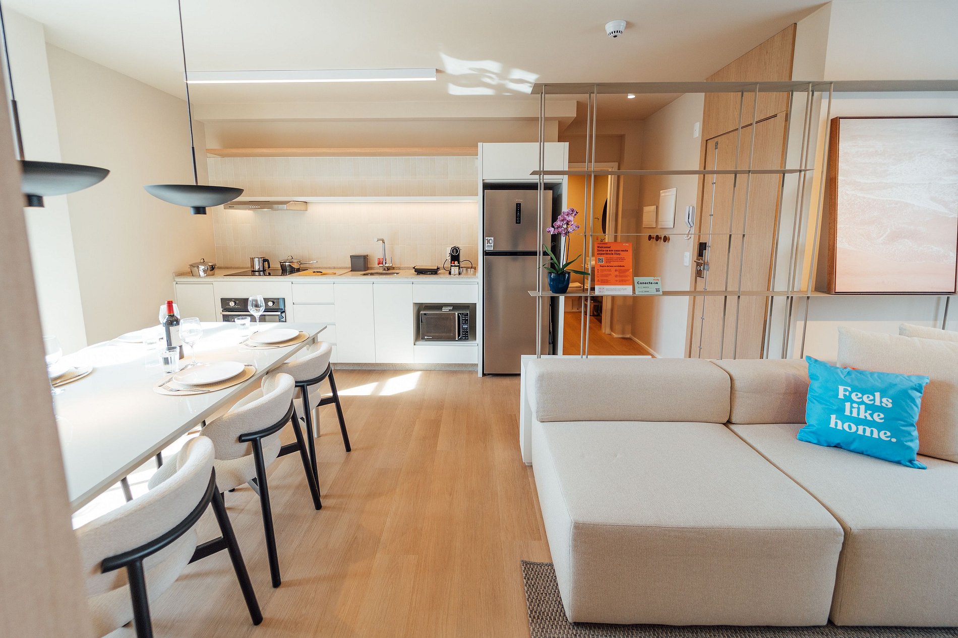 Sinta-se em casa neste apartamento de 75m², onde cada detalhe foi pensado para o seu conforto.Na cozinha completa, você encontra uma geladeira espaçosa, cooktop de indução de duas bocas, depurador, forno, micro-ondas, filtro de água e todos os utensílios que precisa para preparar desde um café da manhã relaxante até um jantar especial. A área de jantar, com mesa para seis pessoas, é o local ideal para reunir amigos ou desfrutar de uma refeição em família.