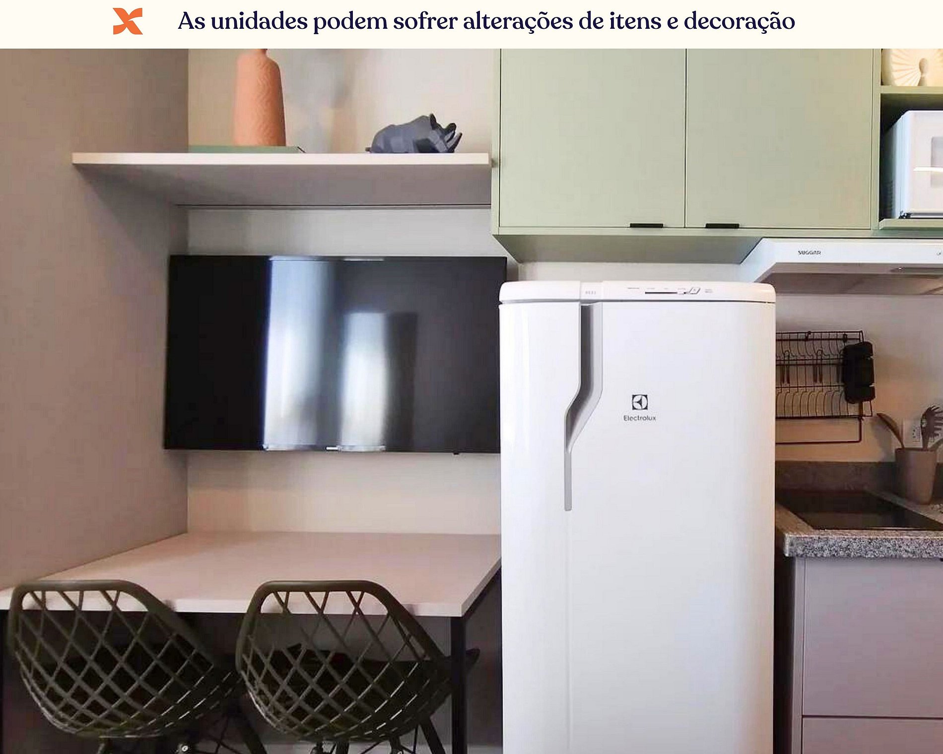 Studio Apartment with 13m², equipped kitchen, gas shower, high-speed internet, smart TV, coffee maker, humidifier, water filter, single bed with air conditioning, microwave, space for home office or study, refrigerator and hair dryer. An intelligent space that balances functionality and style to offer comfort and convenience.