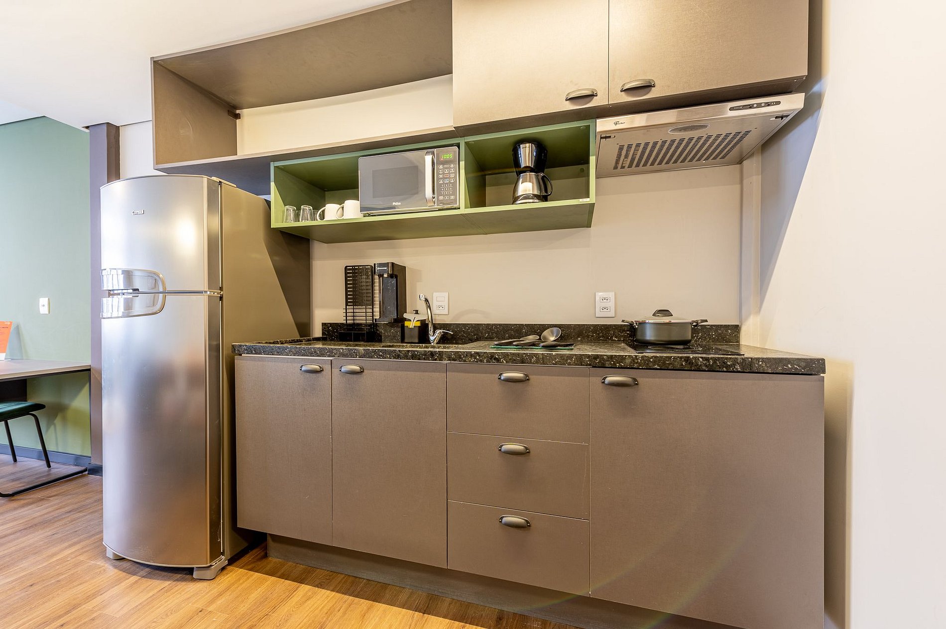Apartamento studio familia com 53m², cozinha equipada, chuveiro a gás, internet de alta velocidade, TV smart, cafeteira, vaporizador, filtro de água, cama Queen, ar condicionado, micro-ondas, espaço para home office ou estudo, geladeira, secador de cabelos e sofá-cama. Um espaço inteligente que equilibra funcionalidade e estilo para oferecer conforto e praticidade.