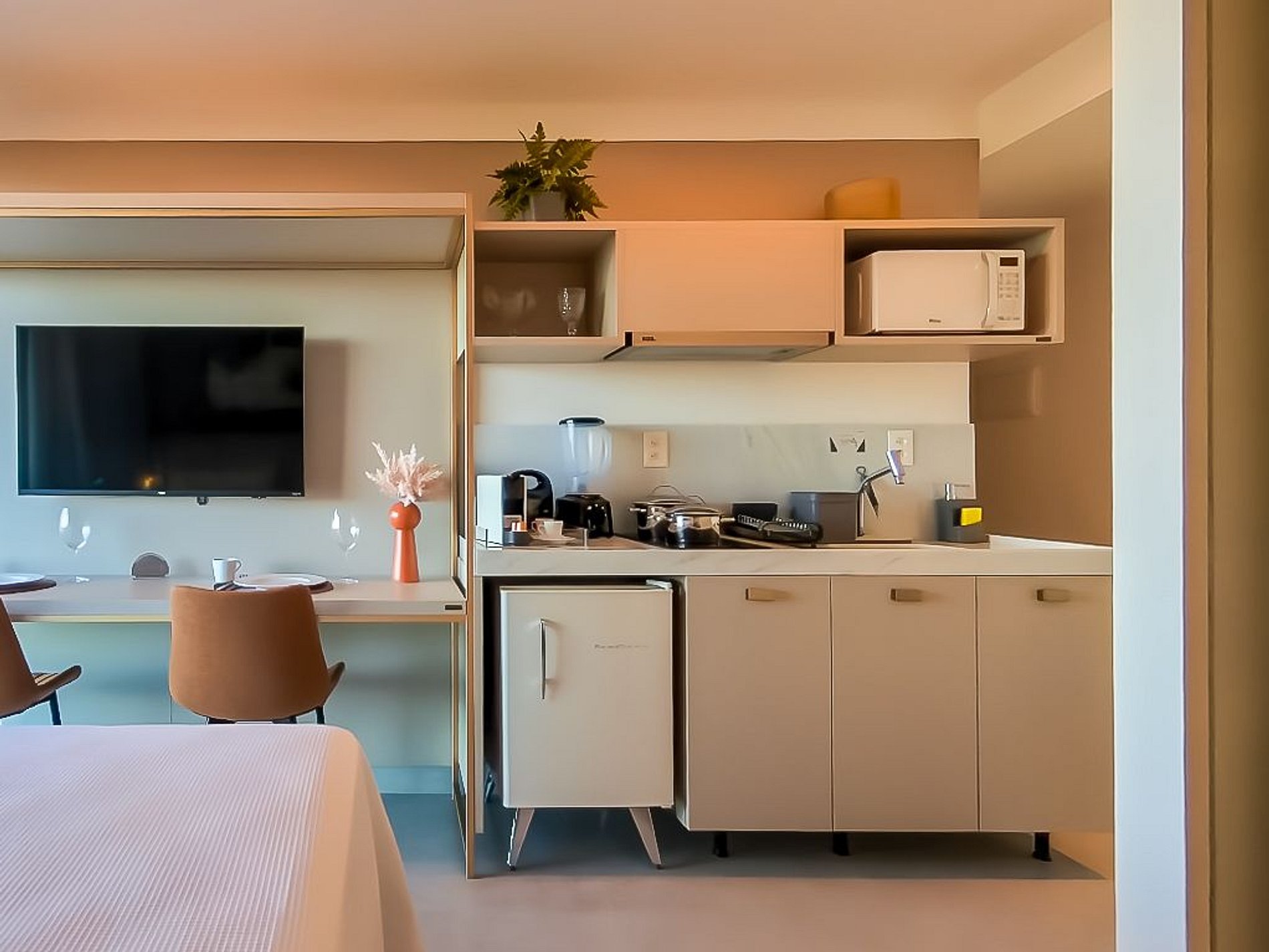 Modern kitchen with minibar, microwave, two-burner induction cooktop, range hood, coffee maker, and all essential utensils.