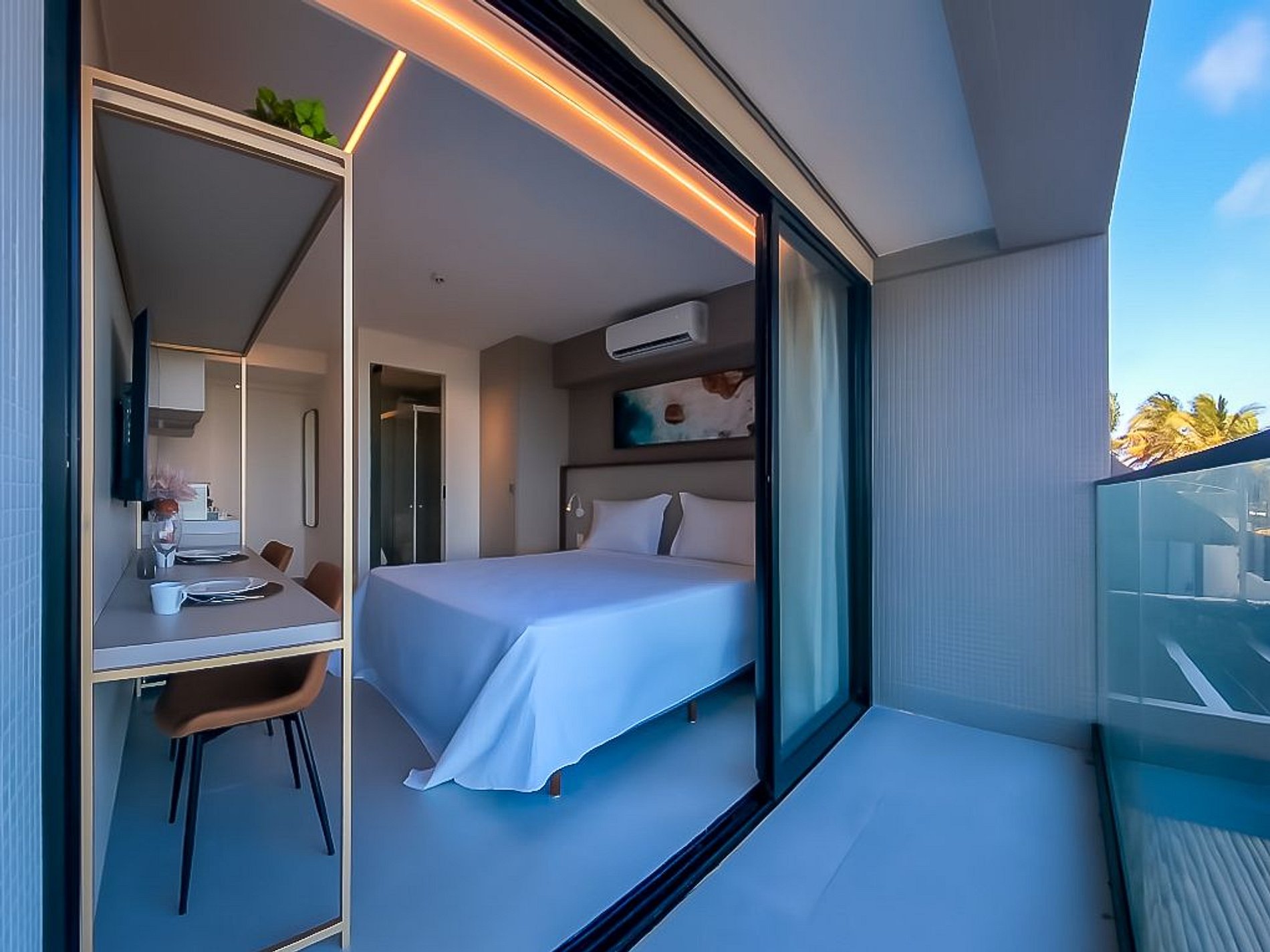 On the balcony, the sea view invites you to slow down. Enjoy a table with four chairs by the outdoor pool—perfect for breakfast under the blue sky or a sunset toast.