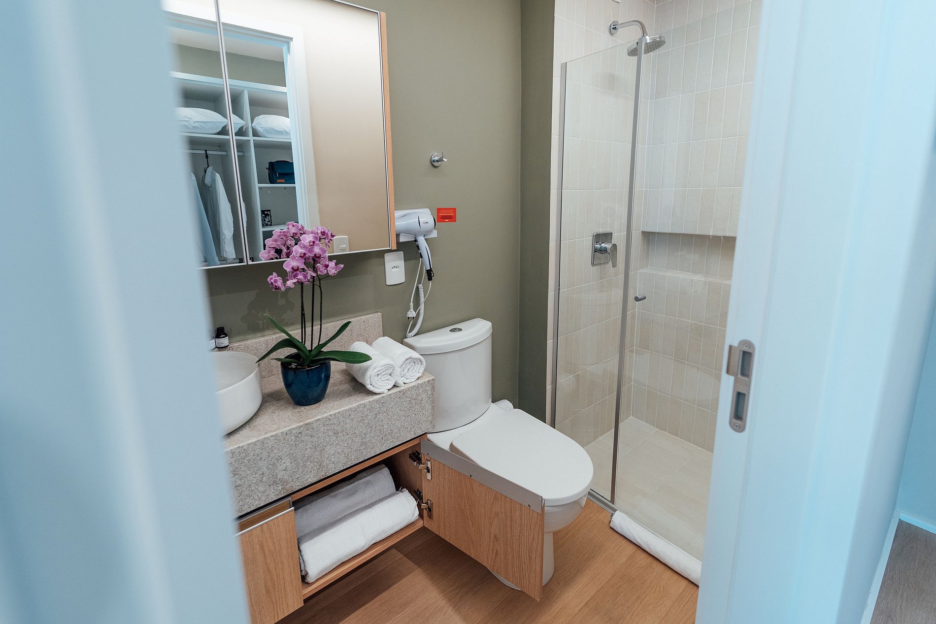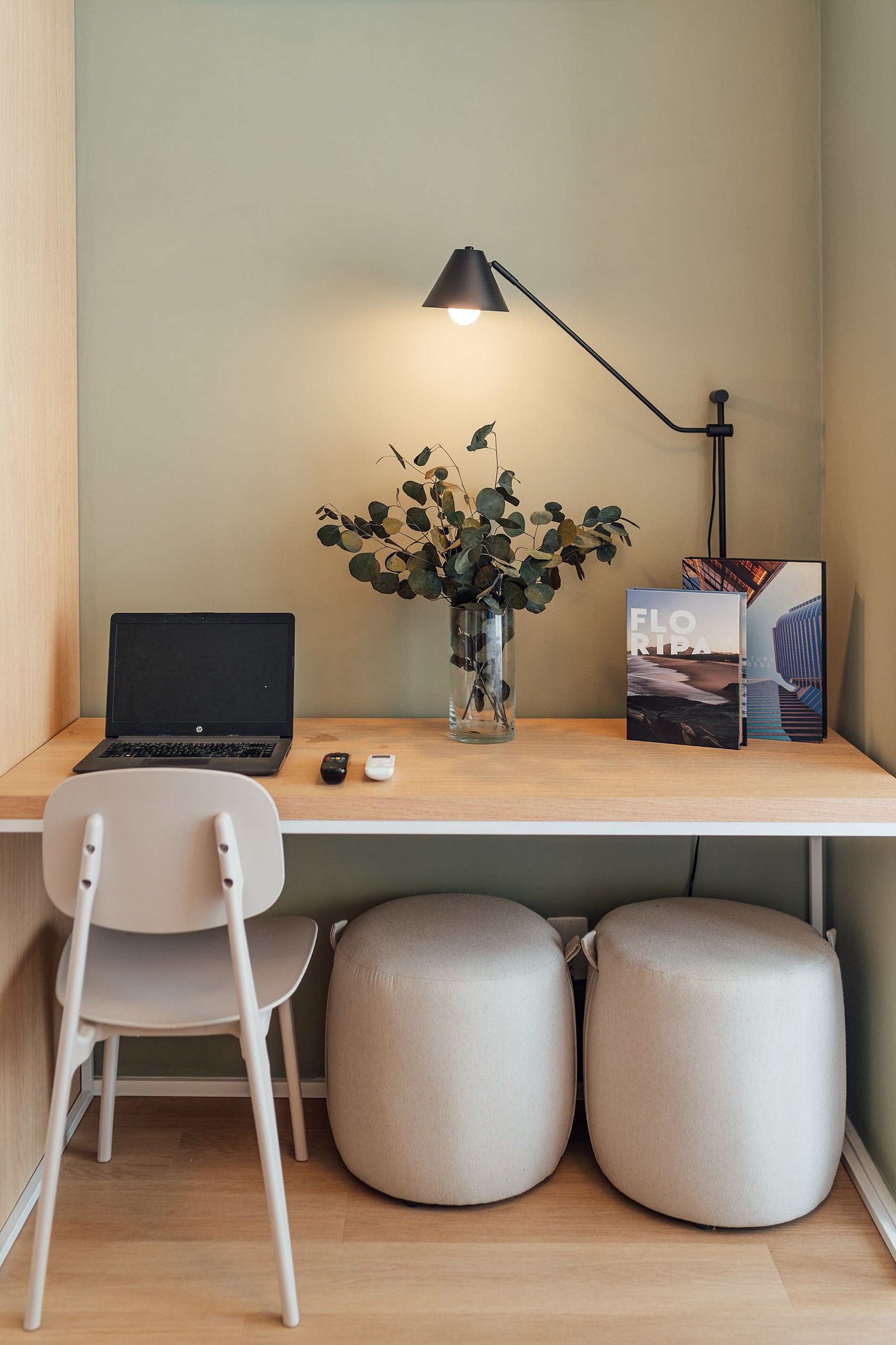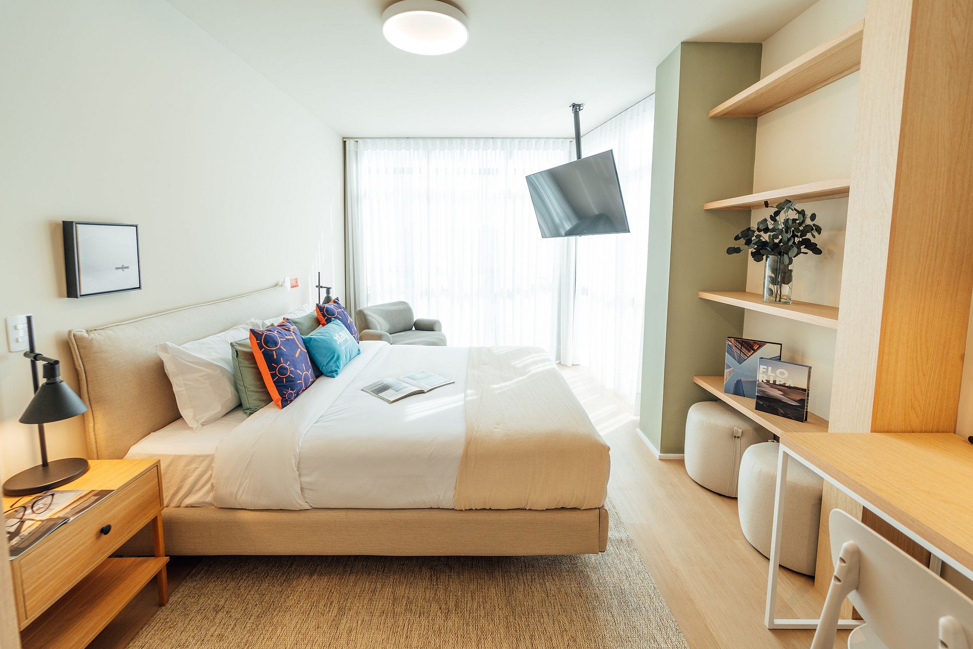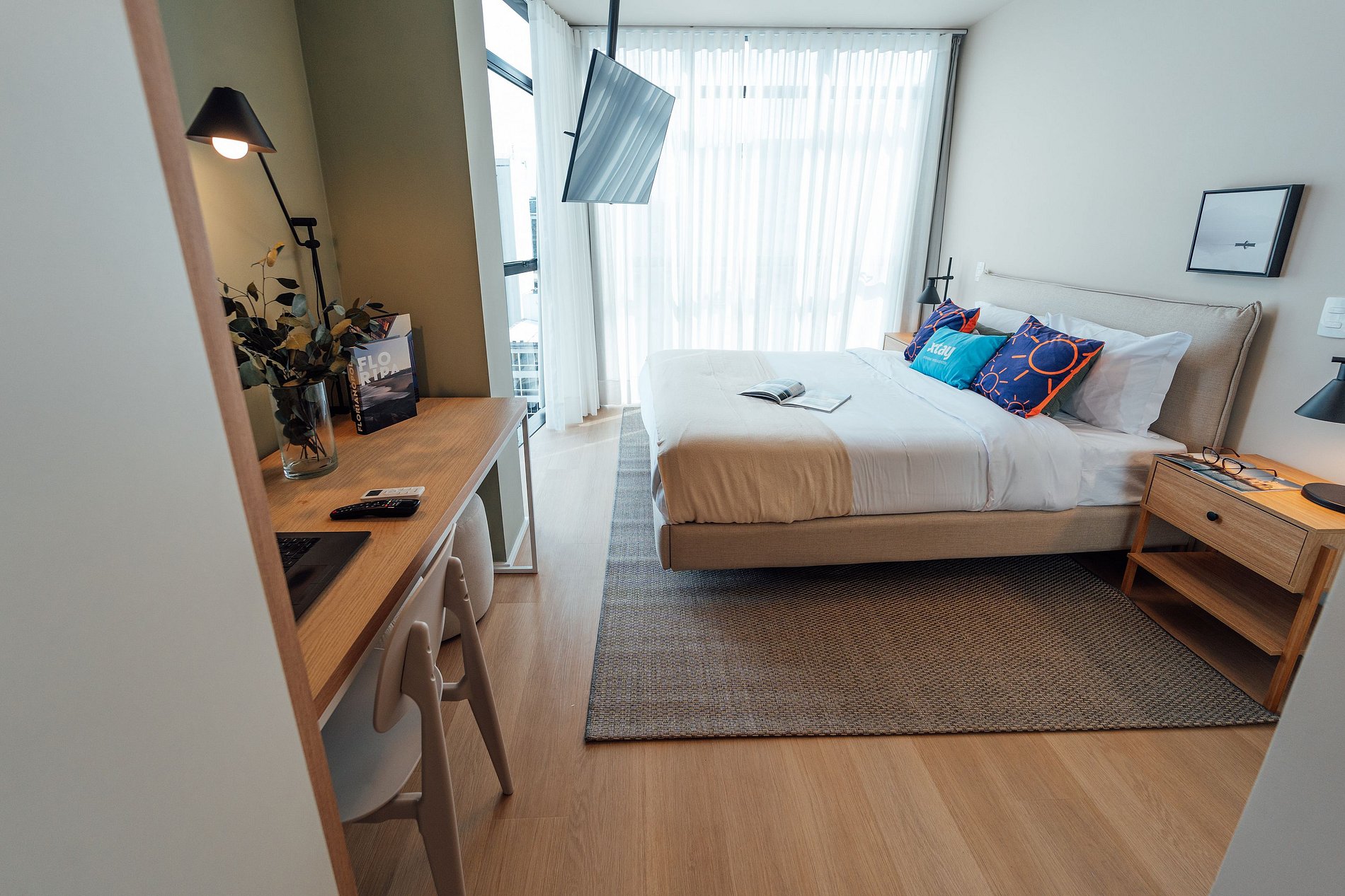 As you enter the suites, you are welcomed by spaces designed for your well-being. The first suite features an inviting queen bed, air conditioning for tranquil nights, blackout curtains for complete privacy, a 50-inch TV for your entertainment, and a workspace with a desk, chair, and ottomans, perfect for those who value productivity even while traveling.
