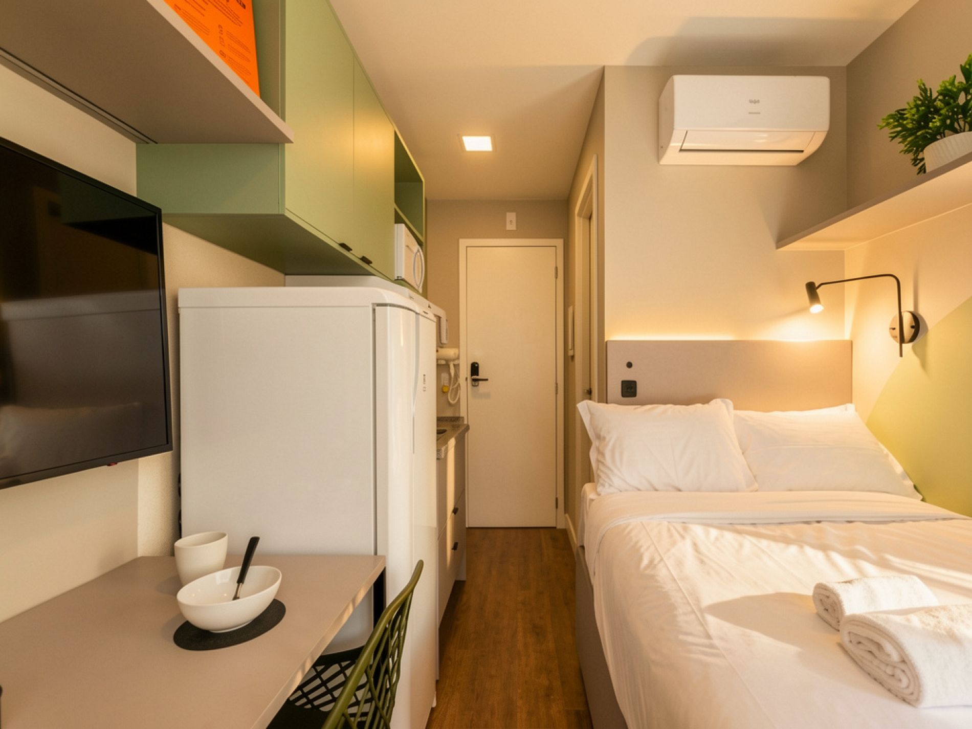 Oferecemos apartamentos Studio e de 1 quarto, totalmente mobiliados, com ar-condicionado split, TV Smart, internet de alta velocidade, cozinha equipada e enxoval completo de cama e banho. Aqui, você terá tudo o que precisa para desfrutar de uma estadia agradável.