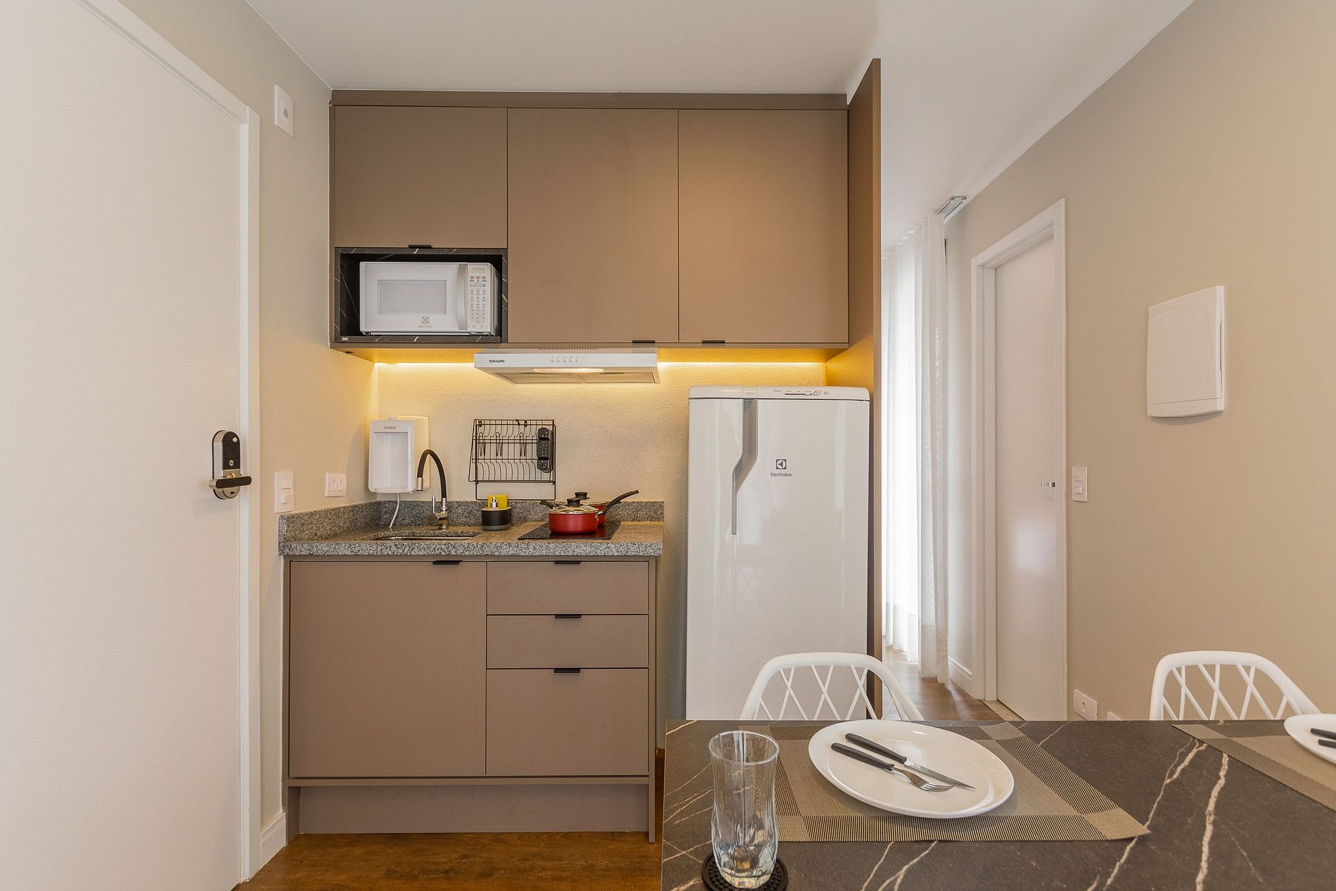 Oferecemos apartamentos Studio e de 1 quarto, totalmente mobiliados, com ar-condicionado split, TV Smart, internet de alta velocidade, cozinha equipada e enxoval completo de cama e banho. Aqui, você terá tudo o que precisa para desfrutar de uma estadia agradável.
