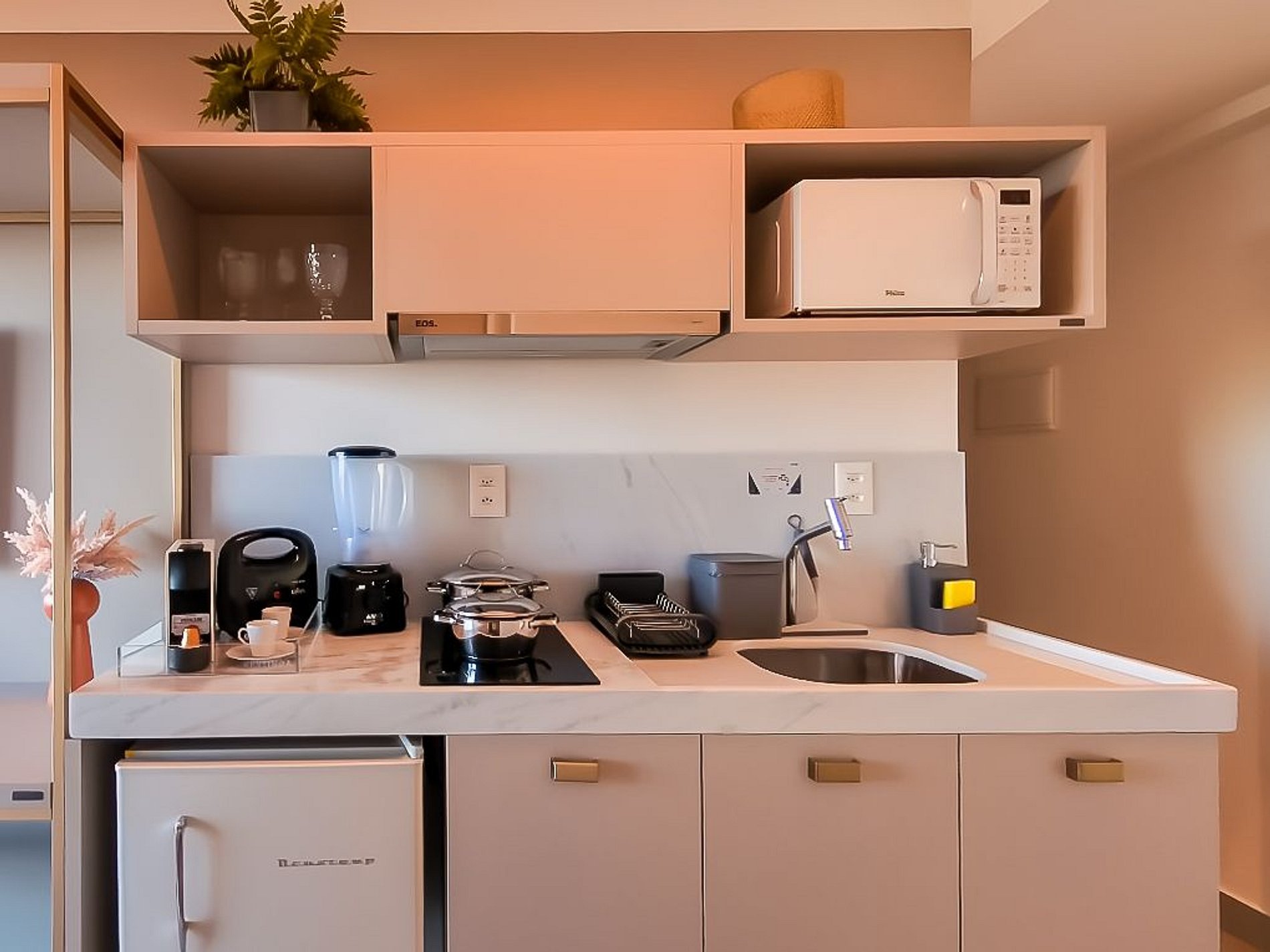 Cocina moderna con frigobar, microondas, cocina de inducción de dos quemadores, extractor, cafetera y utensilios de cocina.
