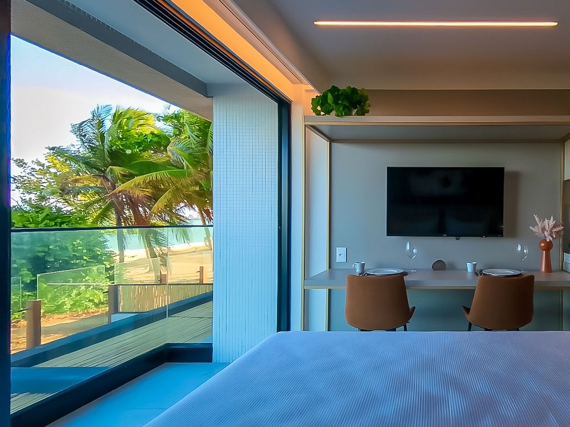 En el balcón, la vista al mar invita a relajarse. Disfruta de una mesa con cuatro sillas junto a la piscina exterior para tomar el desayuno bajo el cielo azul o brindar al atardecer.