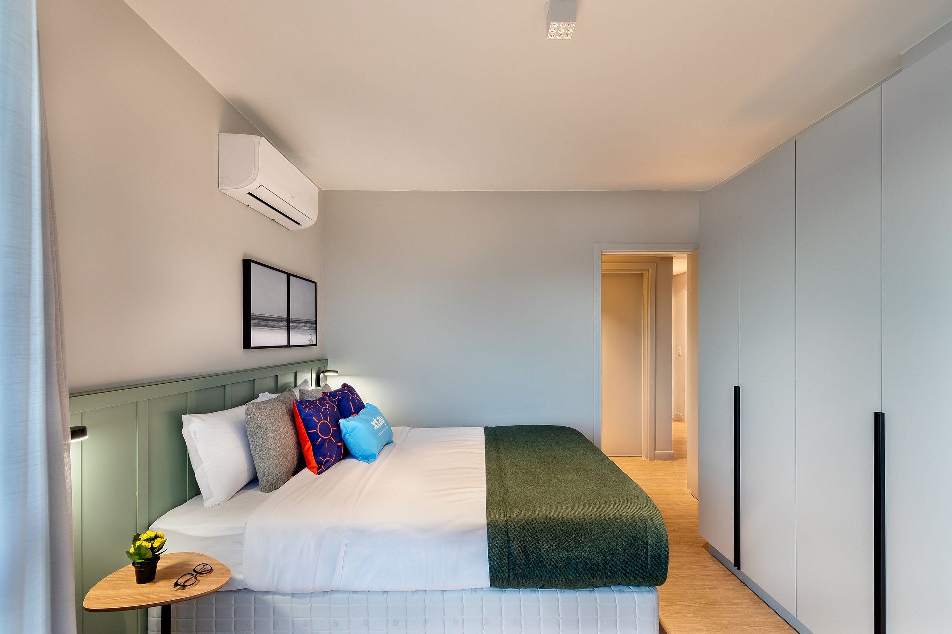 El dormitorio ofrece todo lo necesario para recargar energías: una cama queen suave, aire acondicionado, cortinas blackout para noches tranquilas, un espejo de cuerpo entero y un armario amplio para organizar tus cosas con comodidad.