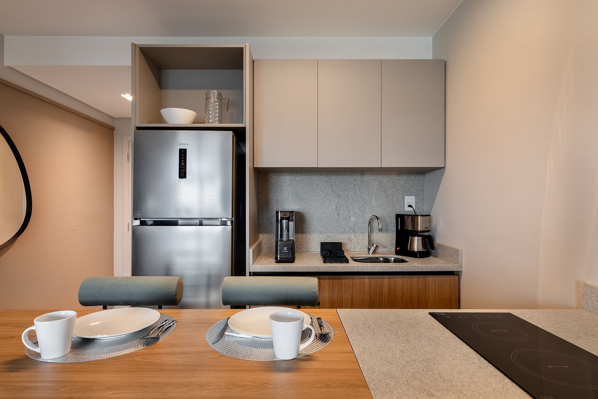 La cocina es completa y funcional, equipada con nevera, microondas, placa de inducción de dos fuegos, filtro de agua, cafetera y todos los utensilios necesarios para que te sientas como en casa al preparar tus comidas. La barra con dos asientos es perfecta tanto para comidas rápidas como para trabajar con comodidad.