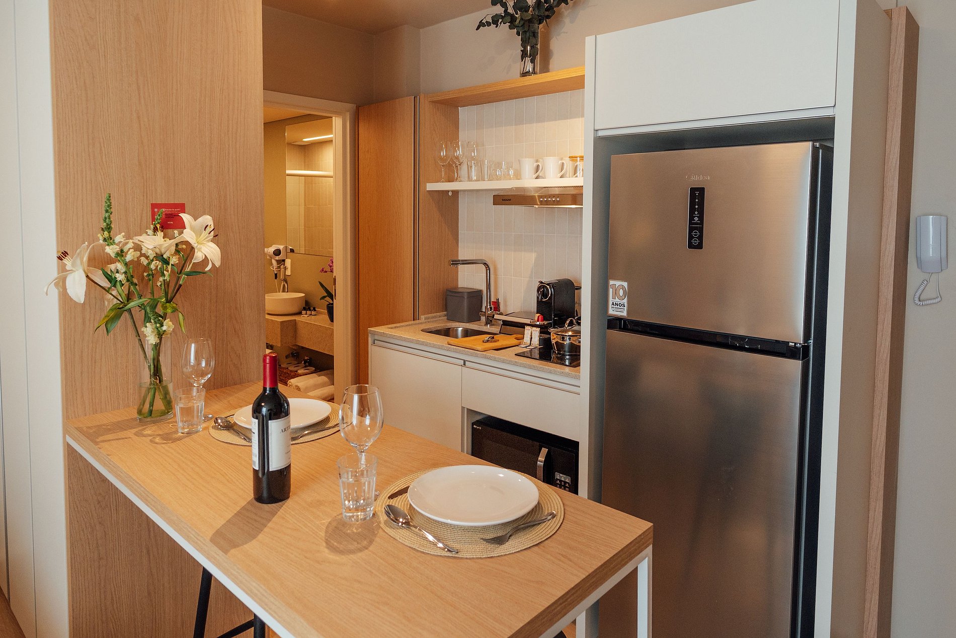 Imagínese en un espacio moderno y acogedor de 20m², diseñado para ofrecer el máximo confort y practicidad. Al entrar, encontrará una cocina completamente equipada, con nevera, placa eléctrica de dos fuegos, campana extractora, microondas, filtro de agua y todos los utensilios necesarios para preparar desde un desayuno especial hasta una cena completa. Al frente, una mesa con dos asientos es el escenario perfecto para comidas acogedoras o para convertir su espacio en una oficina en casa funcional.