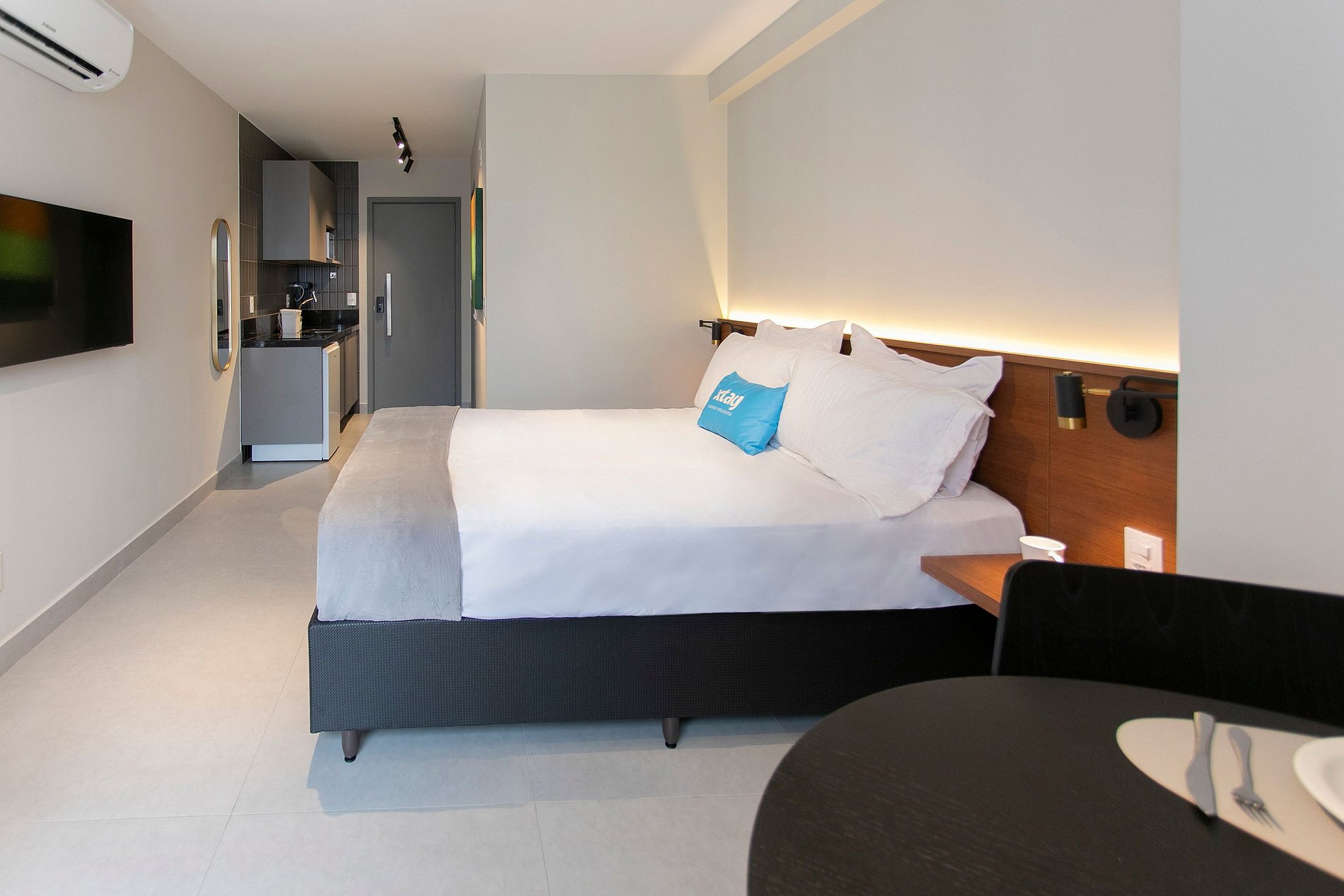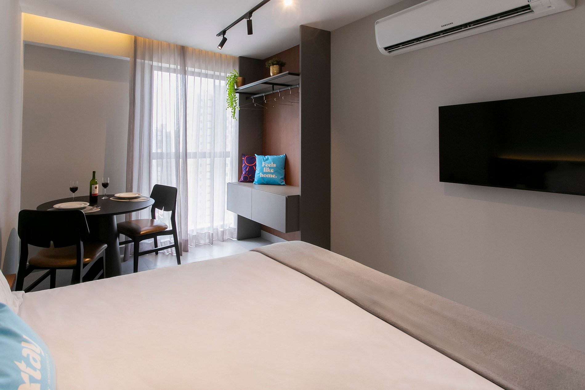 Access to the space is done through facial recognition. The unit password will be sent after your check-in, via the Xtay app or web check-in, as informed by message. The building offers a gym, rooftop pool, and laundry facilities.