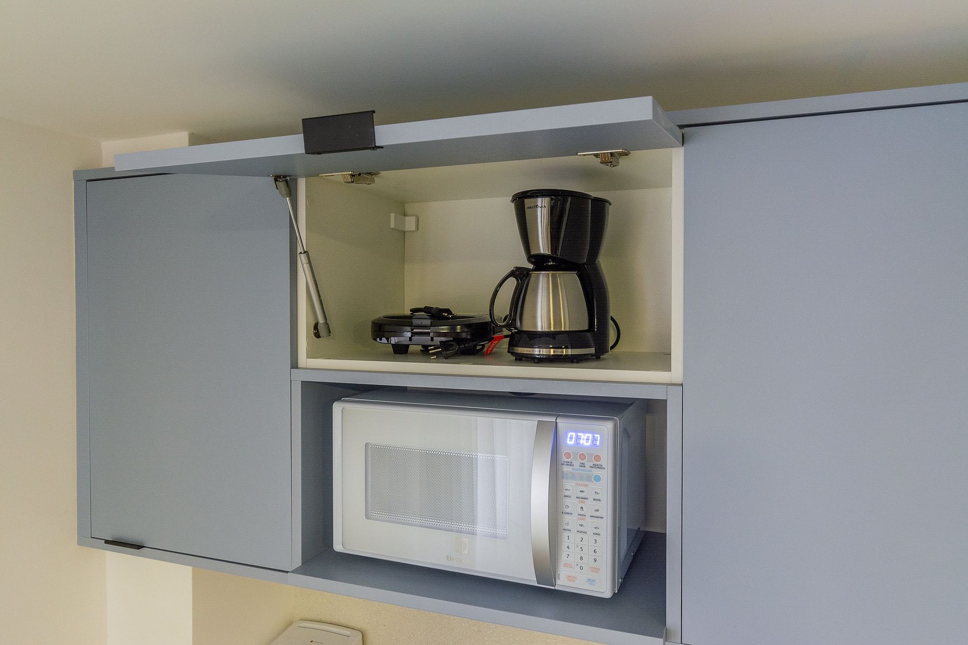 Prepare suas refeições com praticidade em uma cozinha que conta com frigobar, micro-ondas, cooktop de indução, depurador, filtro de água e utensílios básicos.
