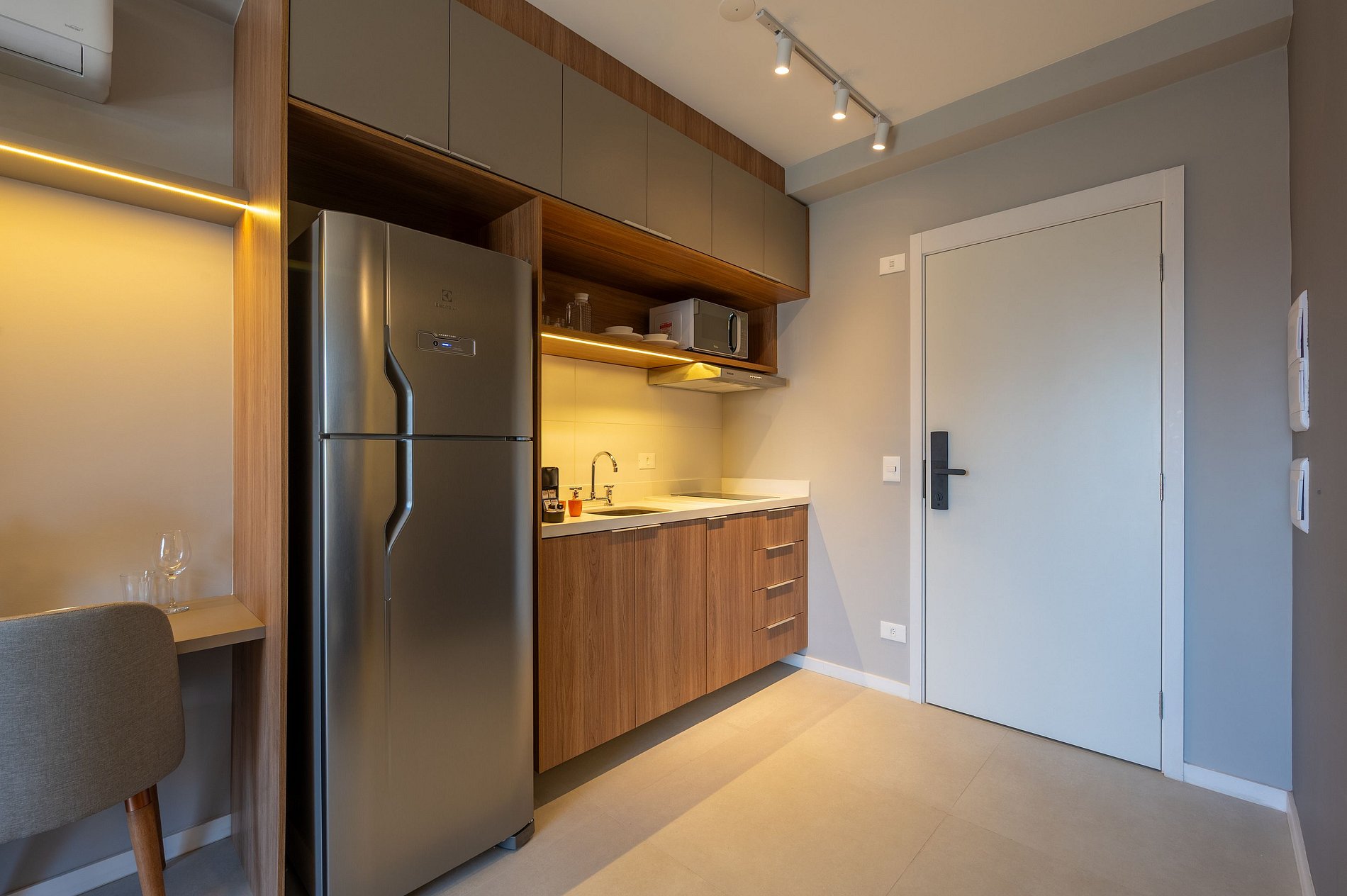O estúdio de 25m² foi pensado em cada detalhe para oferecer conforto, praticidade e estilo. A cozinha completa conta com geladeira, cooktop, depurador, microondas, cafeteira Nespresso e filtro de água, ideal para quem gosta de preparar suas próprias refeições. A bancada com duas cadeiras é perfeita para trabalhar ou fazer suas refeições com conforto.