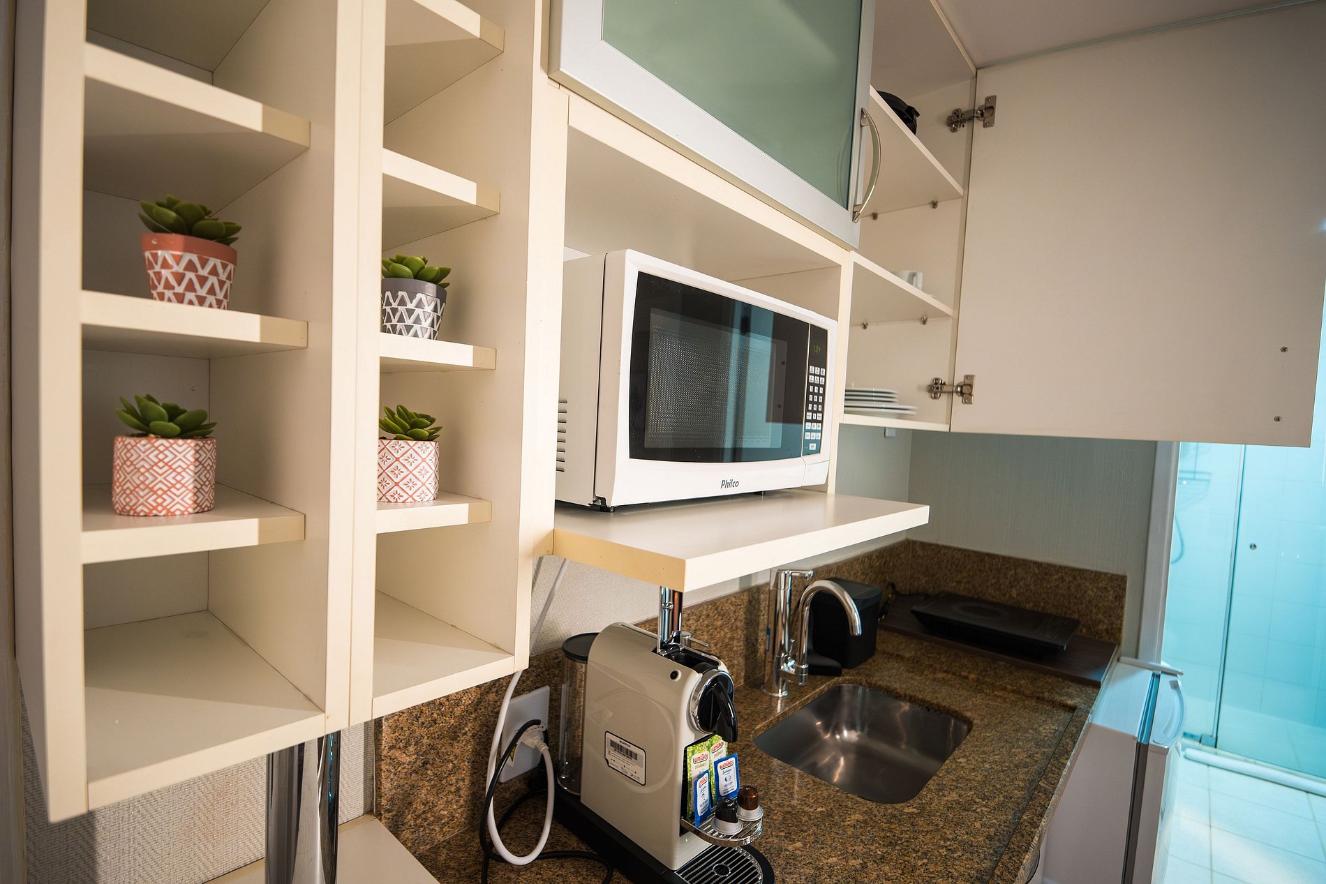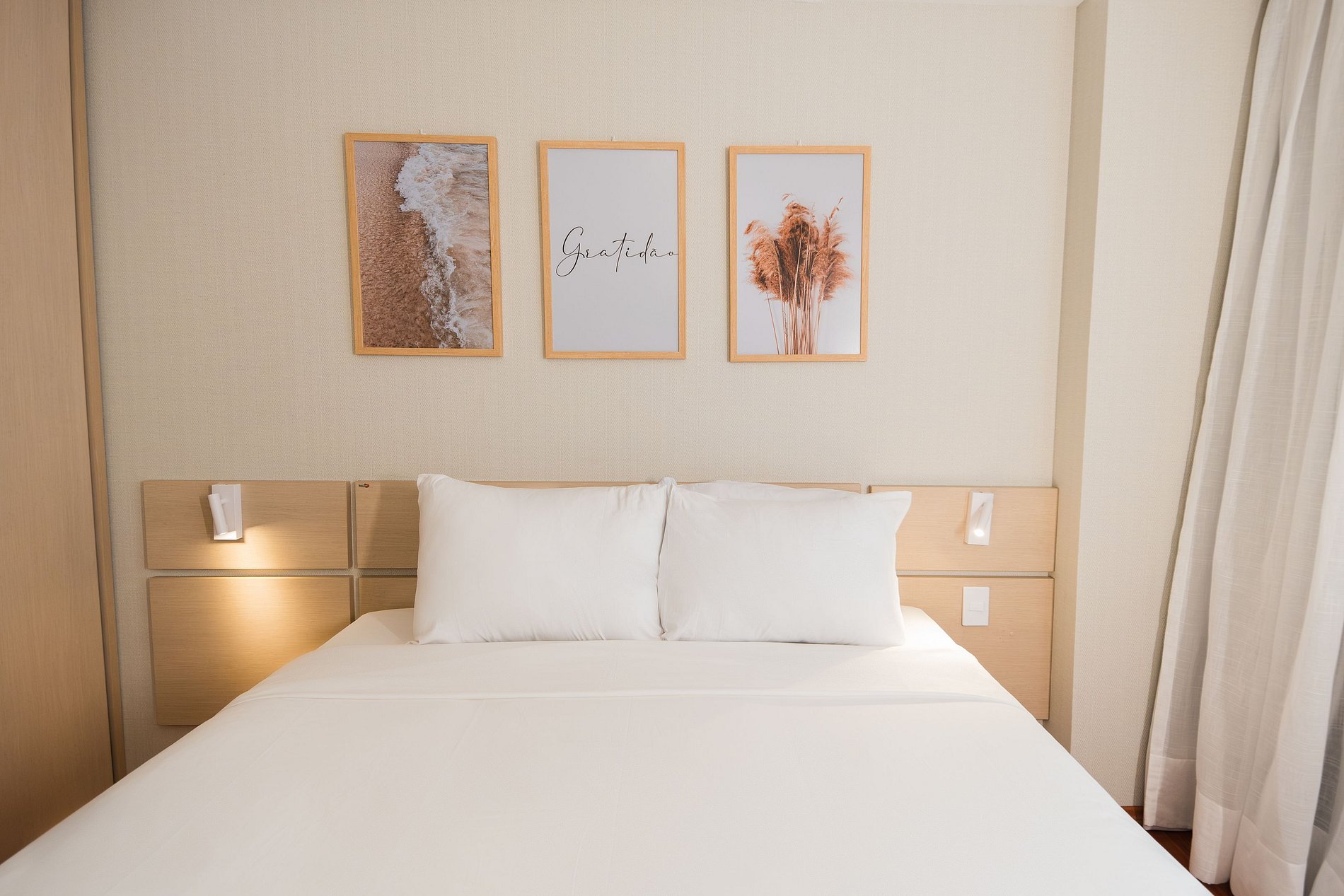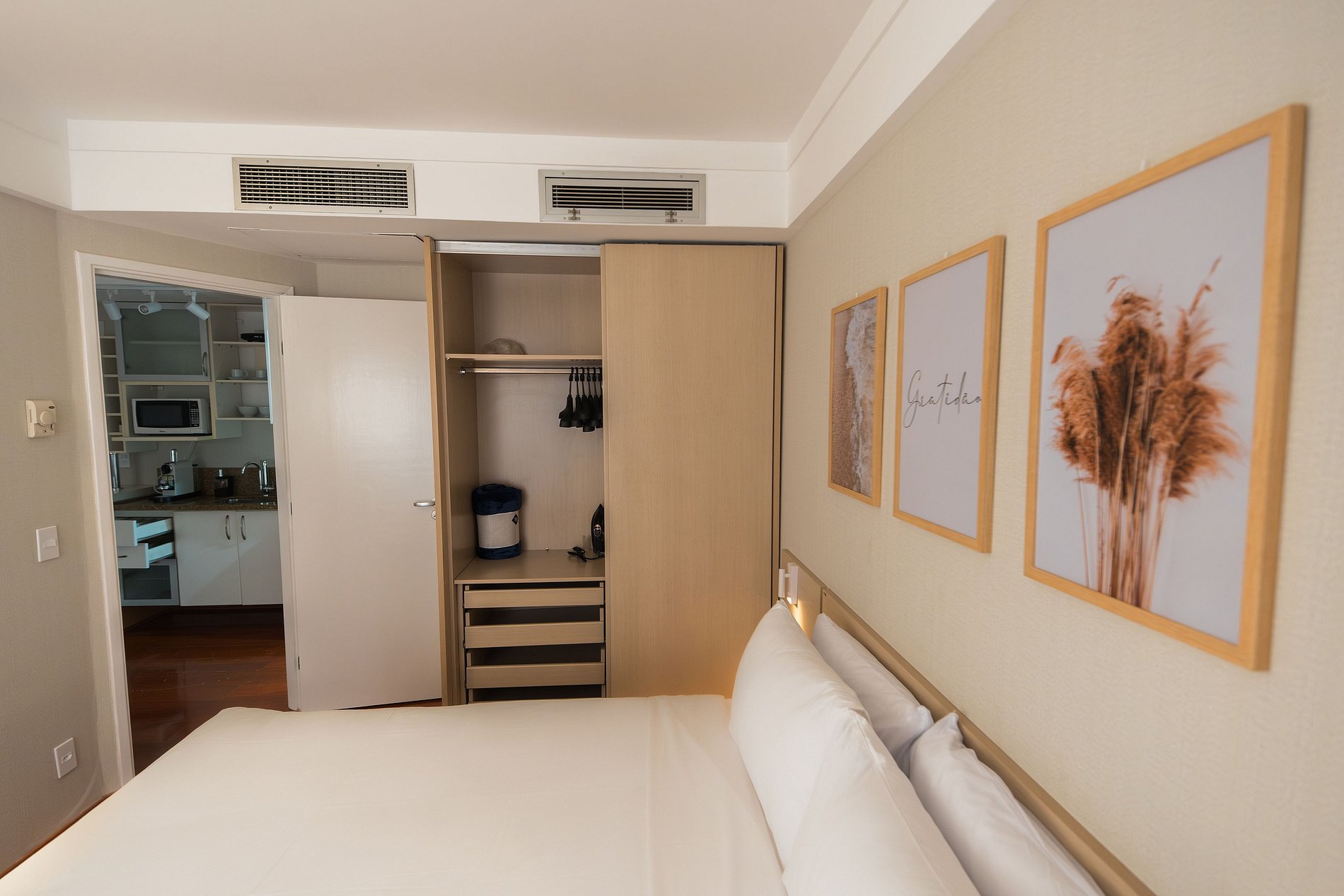 Apartamento de 46m² com 2 dormitórios. 1º quarto com cama de casal queen, ar condicionado, armário com ferro de passar e cabides, Tv smart 42' com acesso a canais a cabo. 2º quarto com cama de solteiro e armário com cabides e ventilação mecânica. Além de sofá cama na sala e Tv 50' com acesso a canais a cabo, ar condicionado, mesa para home office, cozinha compacta com cooktop portátil de 1 boca, frigobar, nespresso, sanduicheira, microondas, filtro de água integrado a torneira, mesa de jantar com 2 lugares, pia com armário, utensílios de cozinha com jogo de panelas, banheiro privativo com banheira e box integrado, ducha higiênica, amenities de banho, secador de cabelo, espelho de aumento e enxoval de cama e banho.