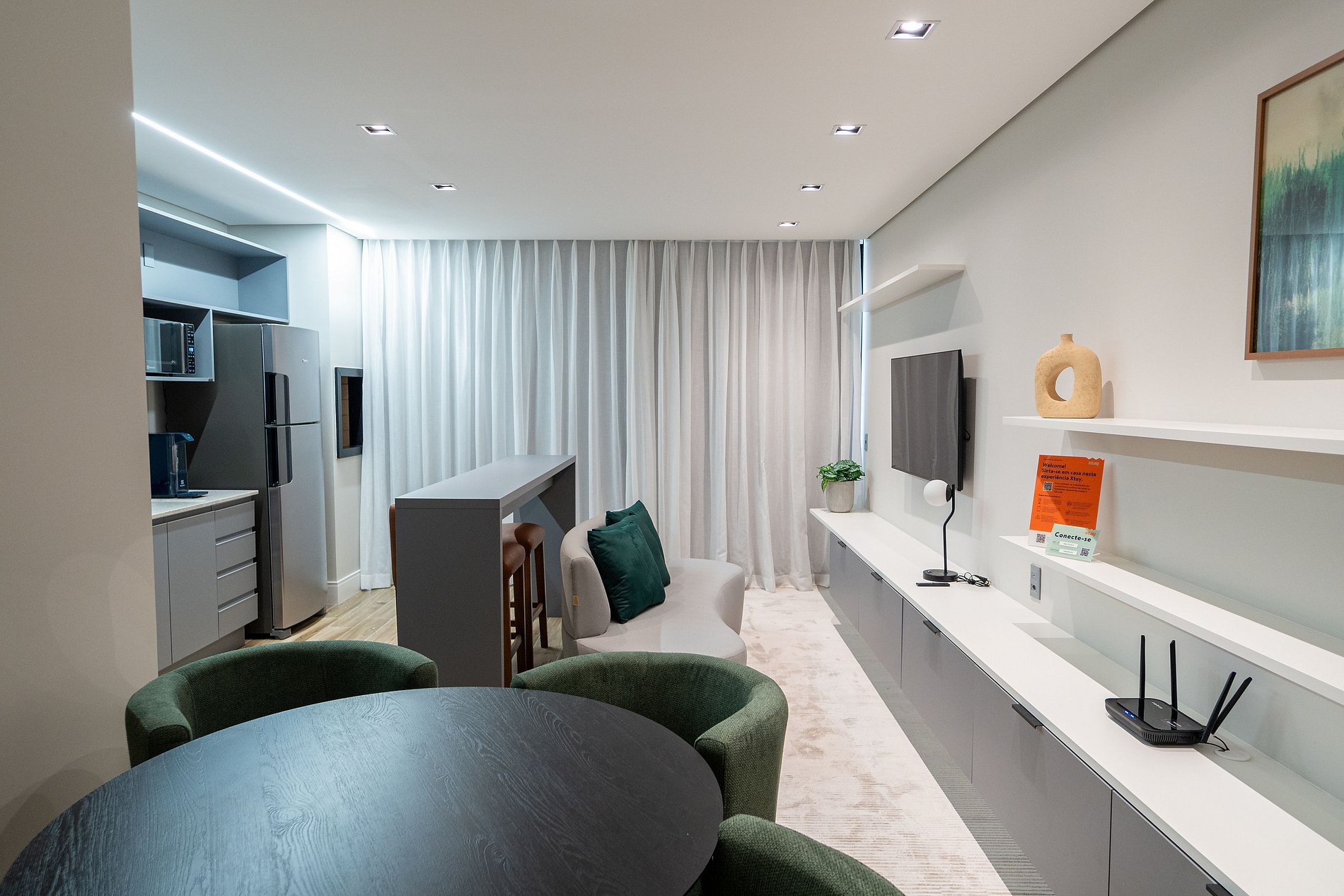 Sala ampla e funcional: sofá confortável, Smart TV para suas maratonas favoritas, mesa de jantar para 4 pessoas e cortinas blackout para criar o clima ideal.