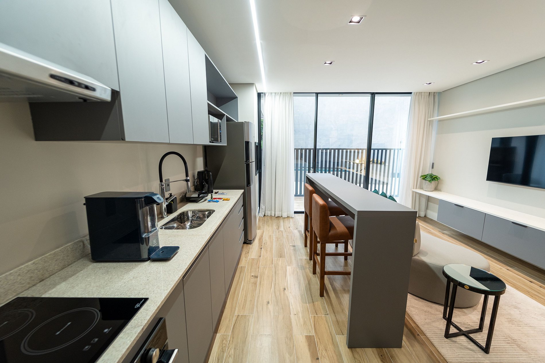 Cozinha completa: cooktop de indução 4 bocas, forno, micro-ondas, geladeira, filtro de água, depurador e todos os utensílios necessários para preparar suas refeições com praticidade.