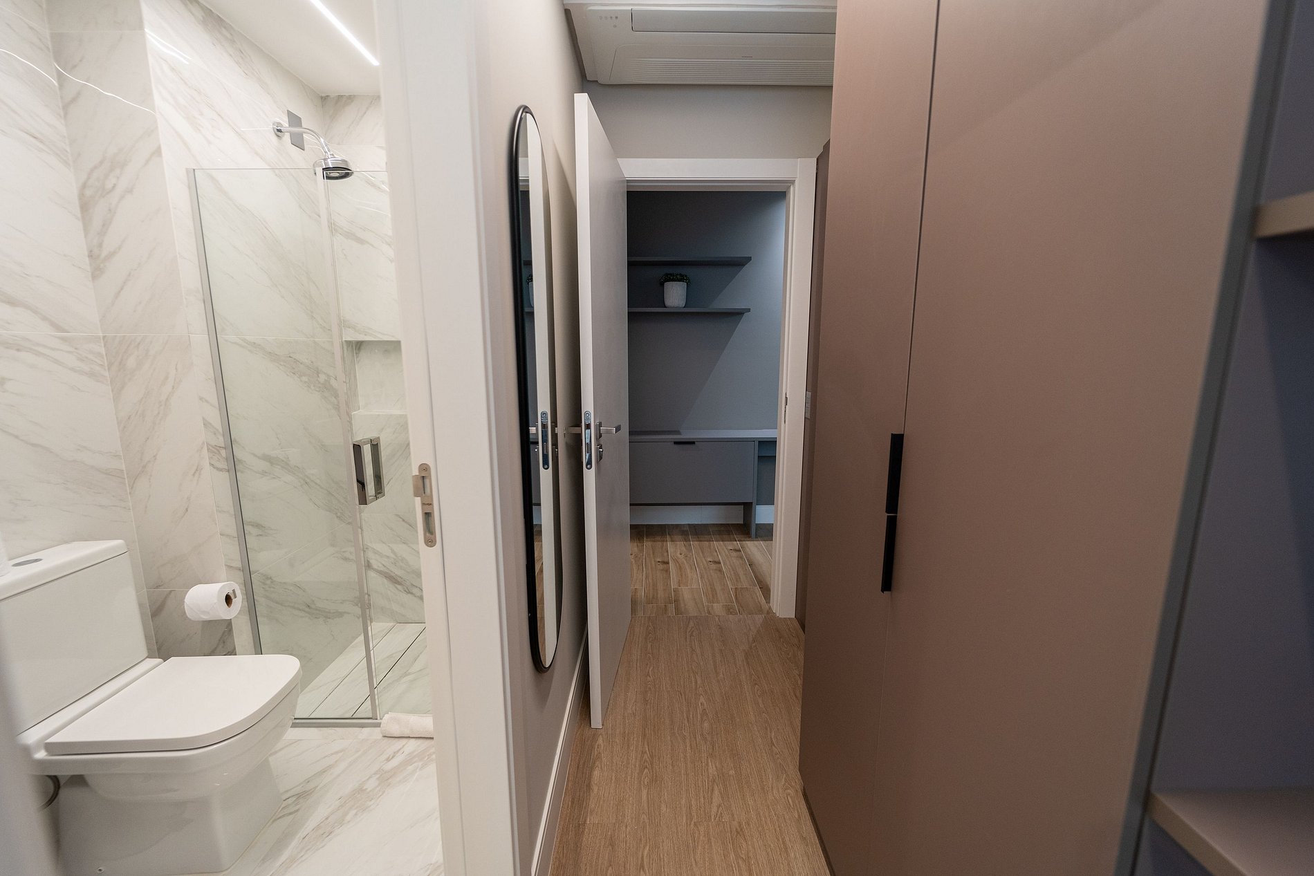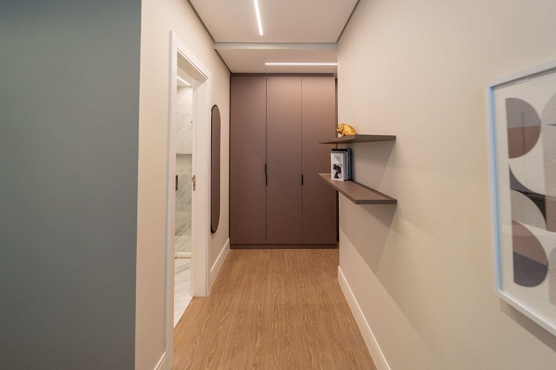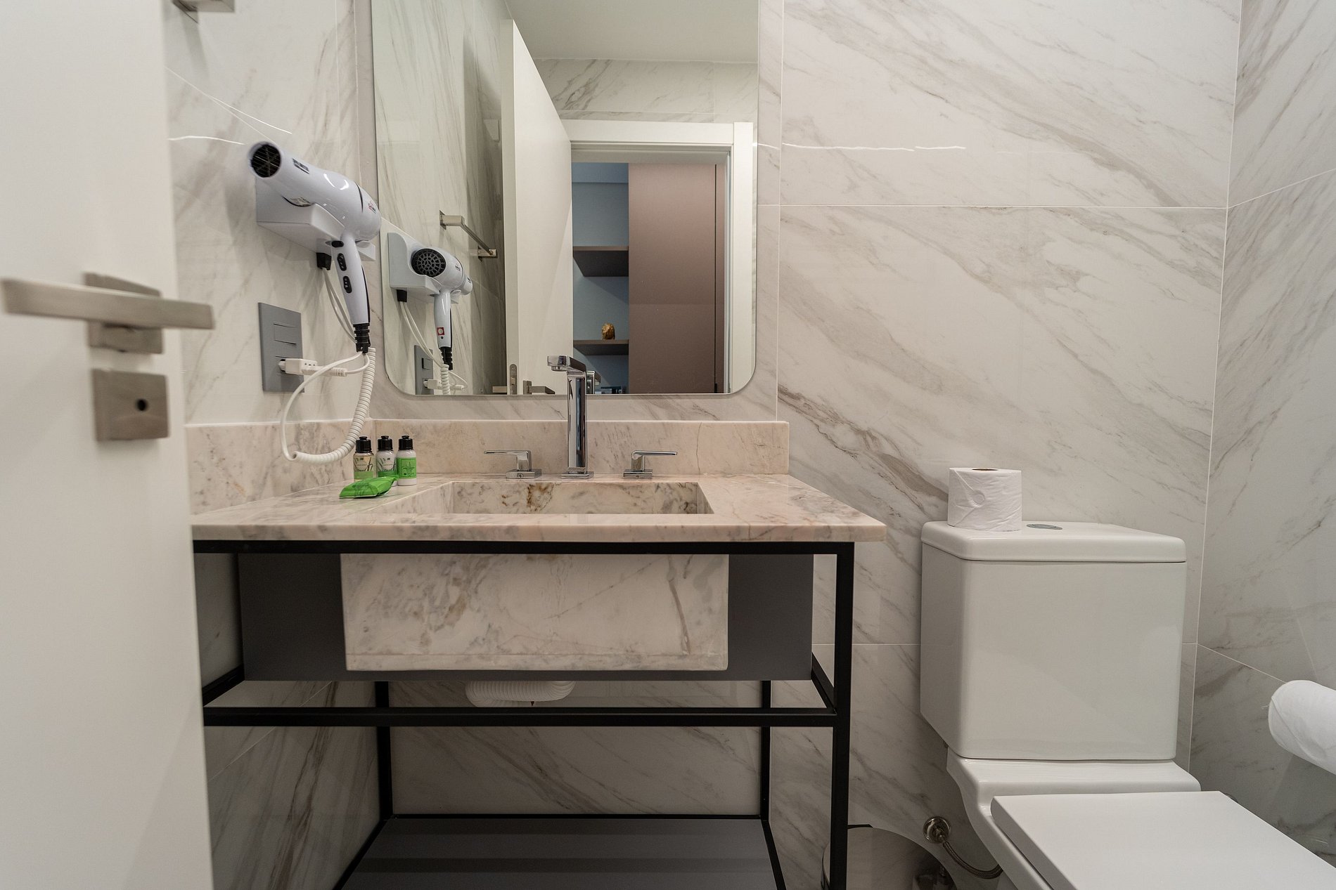 Duas suítes privativas com camas queen, ar-condicionado, cortinas blackout, TV, espelho e guarda-roupas espaçosos. Além disso, há um lavabo extra para ainda mais praticidade.