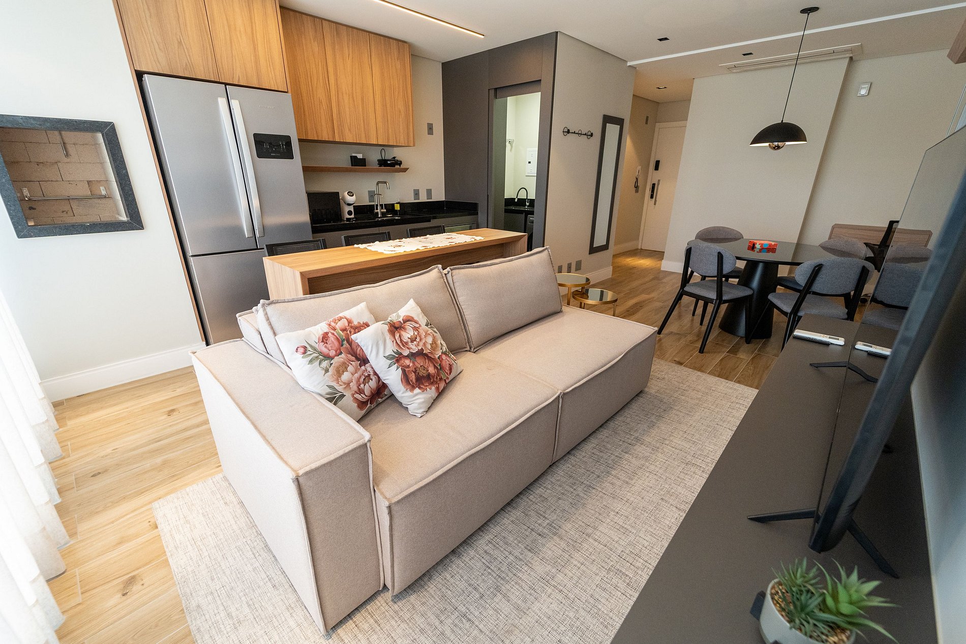 A sala é espaçosa, com sofá confortável, Smart TV e cortinas para maior privacidade. Ao lado, uma cozinha equipada com forno, cooktop 4 bocas, geladeira, filtro de água e utensílios — perfeita para quem gosta de cozinhar. A bancada com 3 cadeiras altas é ideal para refeições rápidas ou momentos descontraídos.