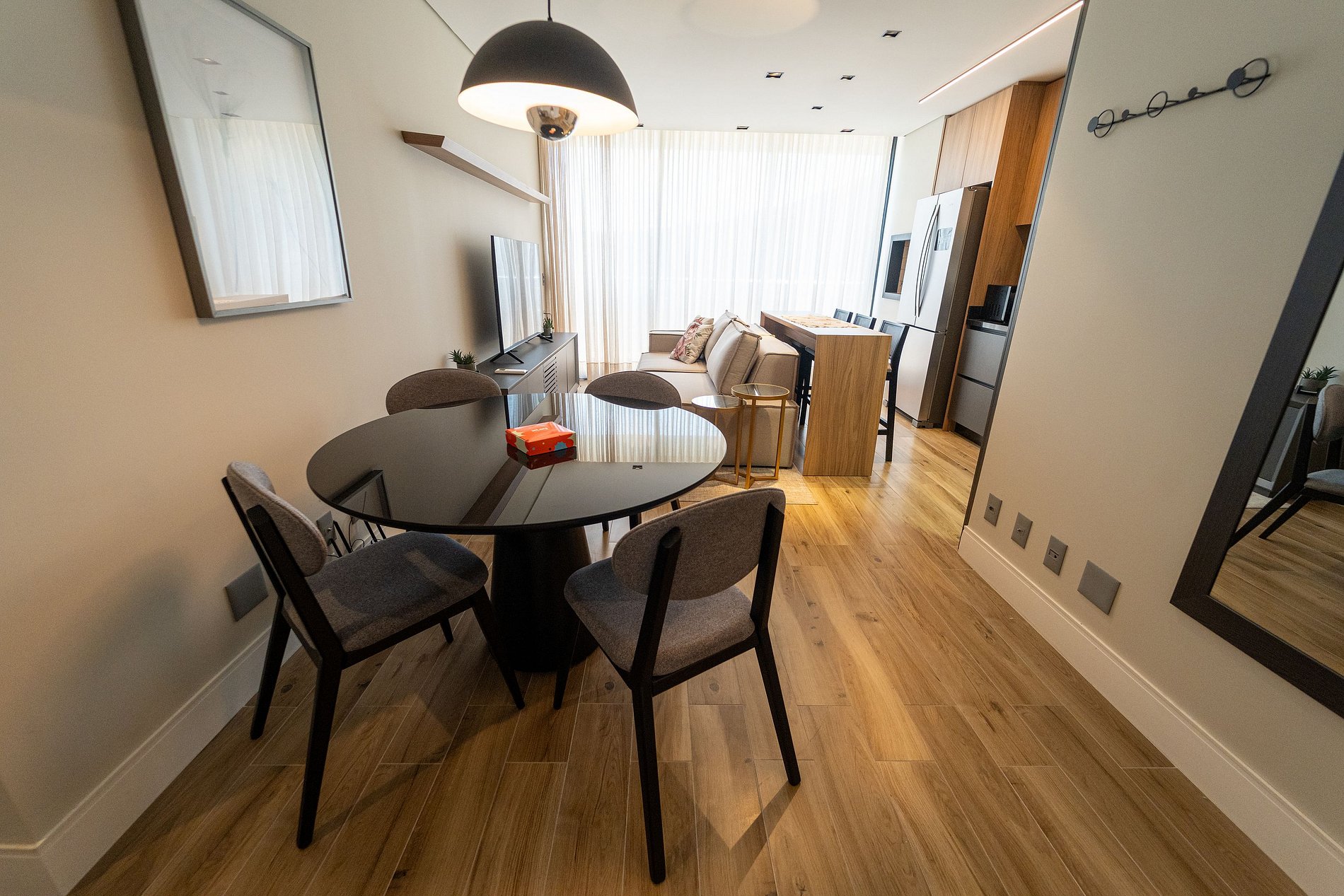 Você conta com uma mesa de jantar para 4 pessoas e um espelho de corpo inteiro que amplia o ambiente e traz mais luz ao espaço. Um lavabo funcional complementa a área social.