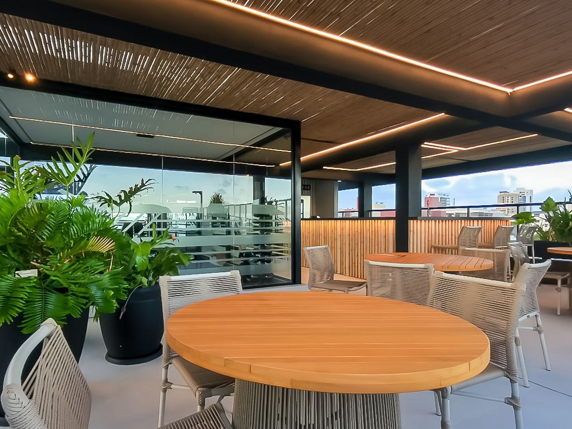 Na sacada, a vista para o mar convida a desacelerar. Aproveite o conjunto de mesa com quatro cadeiras ao lado da piscina externa para tomar um café da manhã sob o céu azul ou brindar ao pôr do sol.