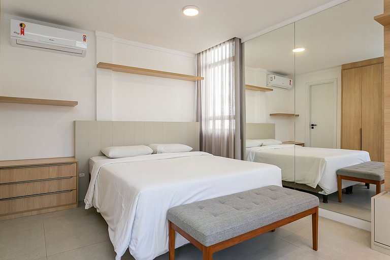 Quarto com cama queen, ar-condicionado, blackout e espelho de corpo inteiro — conforto e descanso garantidos.