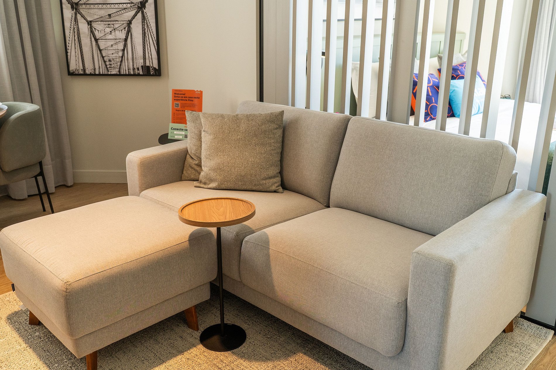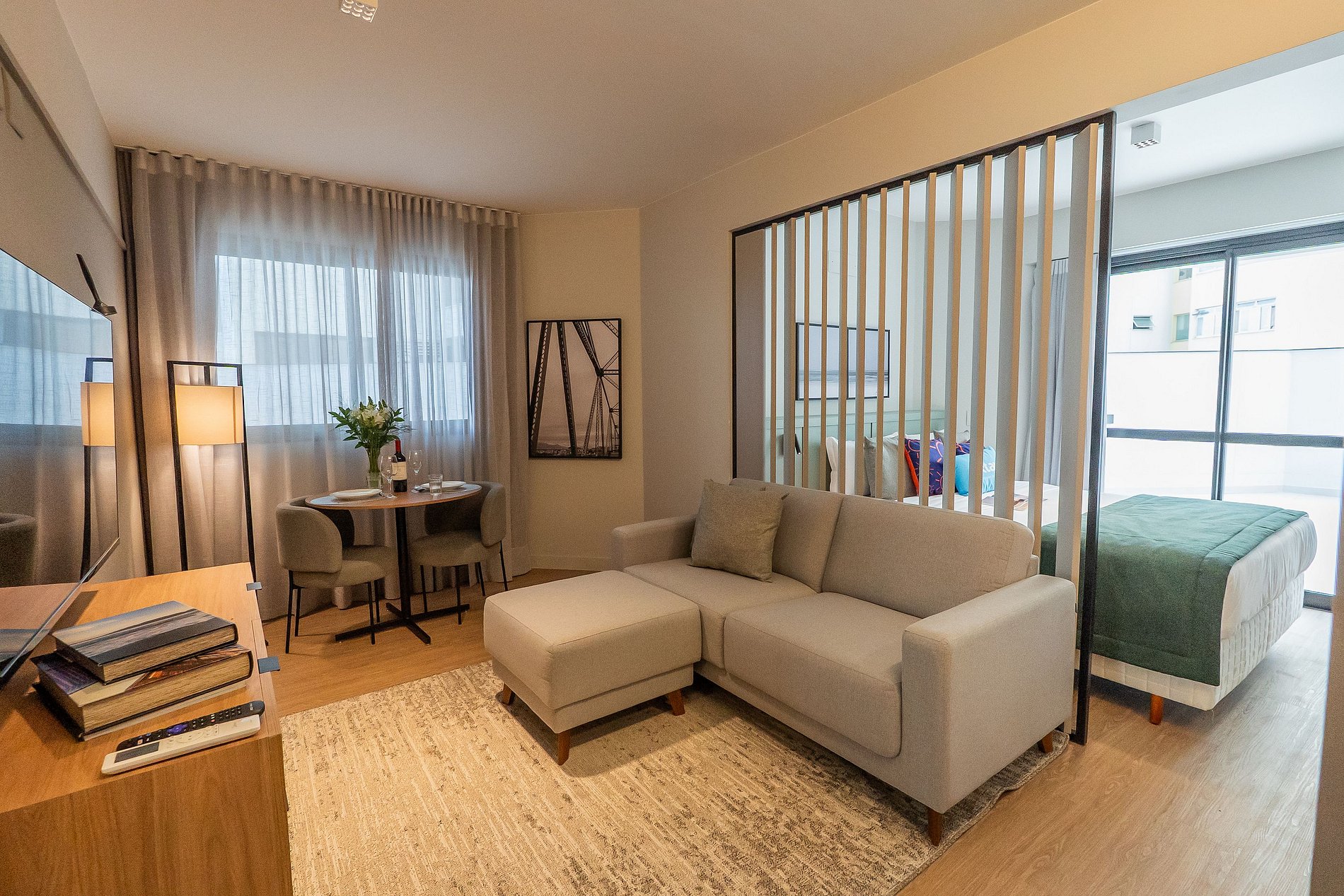 Ao entrar, você encontra uma sala agradável com sofá, TV, ar-condicionado e uma mesa para refeições ou trabalho, tudo com iluminação natural e cortinas blackout para o seu descanso.