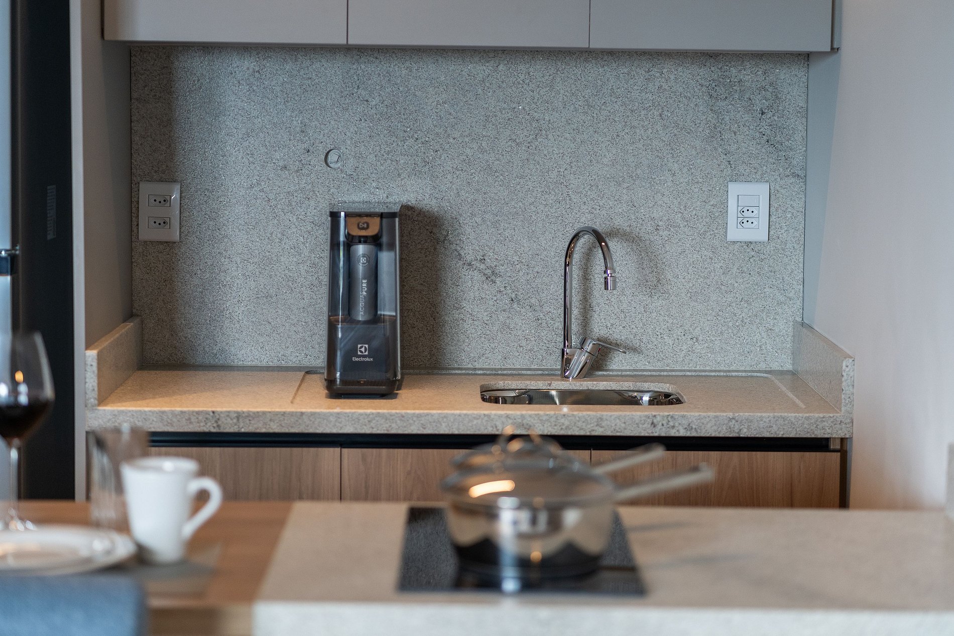 A cozinha é completa e funcional, equipada com geladeira, micro-ondas, cooktop de indução de duas bocas, filtro de água, cafeteira e os utensílios necessários para que você se sinta em casa ao preparar suas refeições. A bancada com dois lugares é perfeita tanto para refeições rápidas quanto para um momento de trabalho com praticidade.