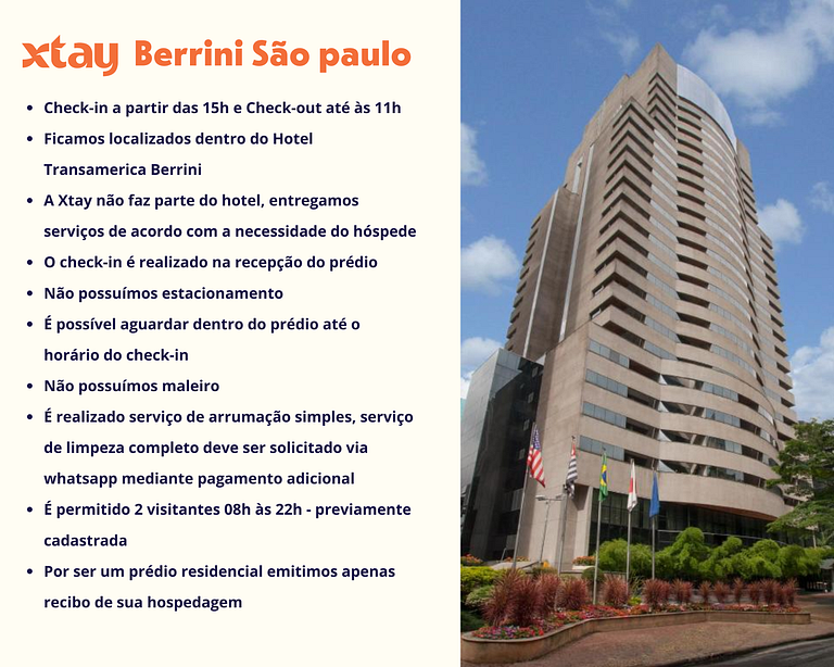 Embora estejamos localizados dentro de um hotel, a Xtay é uma plataforma de hospedagem e moradia por assinatura a parte, não fazemos troca de toalhas e serviço de quarto.